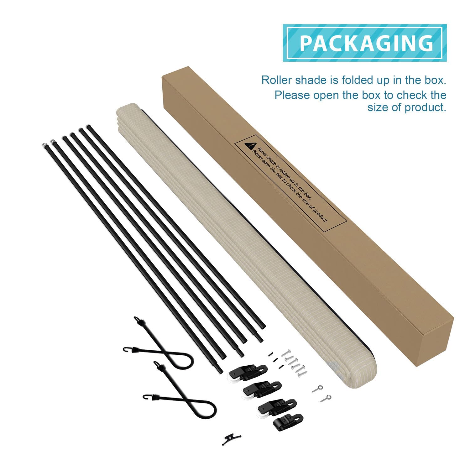 Details: Coarbor outdoor roll up shade for porchCustomized size made in USAVersatile installationHeavy duty 220 GSM polyethyleneBreathable and light filtering90% UV protection and visibility blockagePackage Contents:- Installation Instruction x1- Anchor clip x2- Screws x 6- Pull rope x 1- Fabric x1- Section Pole and Pole connector- Eye Bolt x 2- Zip ties x 10- Tie downs x2 -Rope holder x1- Brackets x2- Wire rope x1- Hex key x1If you are missing any parts, feel free to contact us.