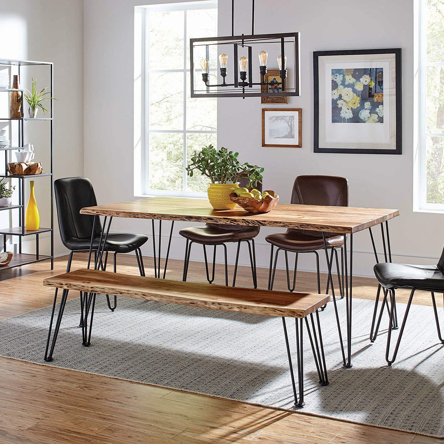 Details: The perfect marriage of rustic charm and industrial design, this rectangular dining bench makes a modern statement. Designed with natural acacia, the bench top features an exposed wood grain with slight distressing. Contrasting against this warmth is the dark tone from the gunmetal finish of the legs. Four open hairpins, created with thin metal, support the rustic top. Add coziness to a sleek and contemporary motif with the charming hues and materials.
