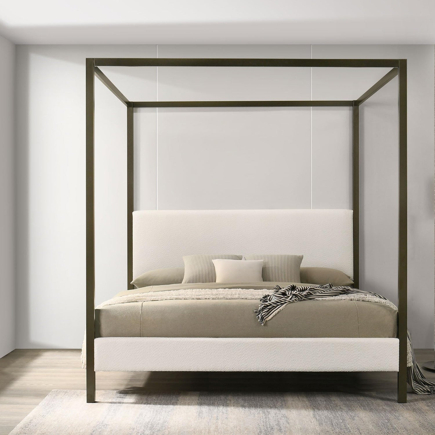 Details: Bring refined style and character to your bedroom with a contemporary upholstered bed. An instant focal point, it features a clean-lined silhouette with a padded headboard and rails and a four-post canopy frame that create gravitas. The frame adds a bronze finish that assures it stands out, while soft vanilla fabric is light and warm for an inviting finishing touch. Its engaging frame adds height to your bedroom with its open canopy and slim posts, perfect for blending modern and traditional design elements. The bed includes wooden slats and three additional center support legs to ensure strength and stability for lasting enjoyment.