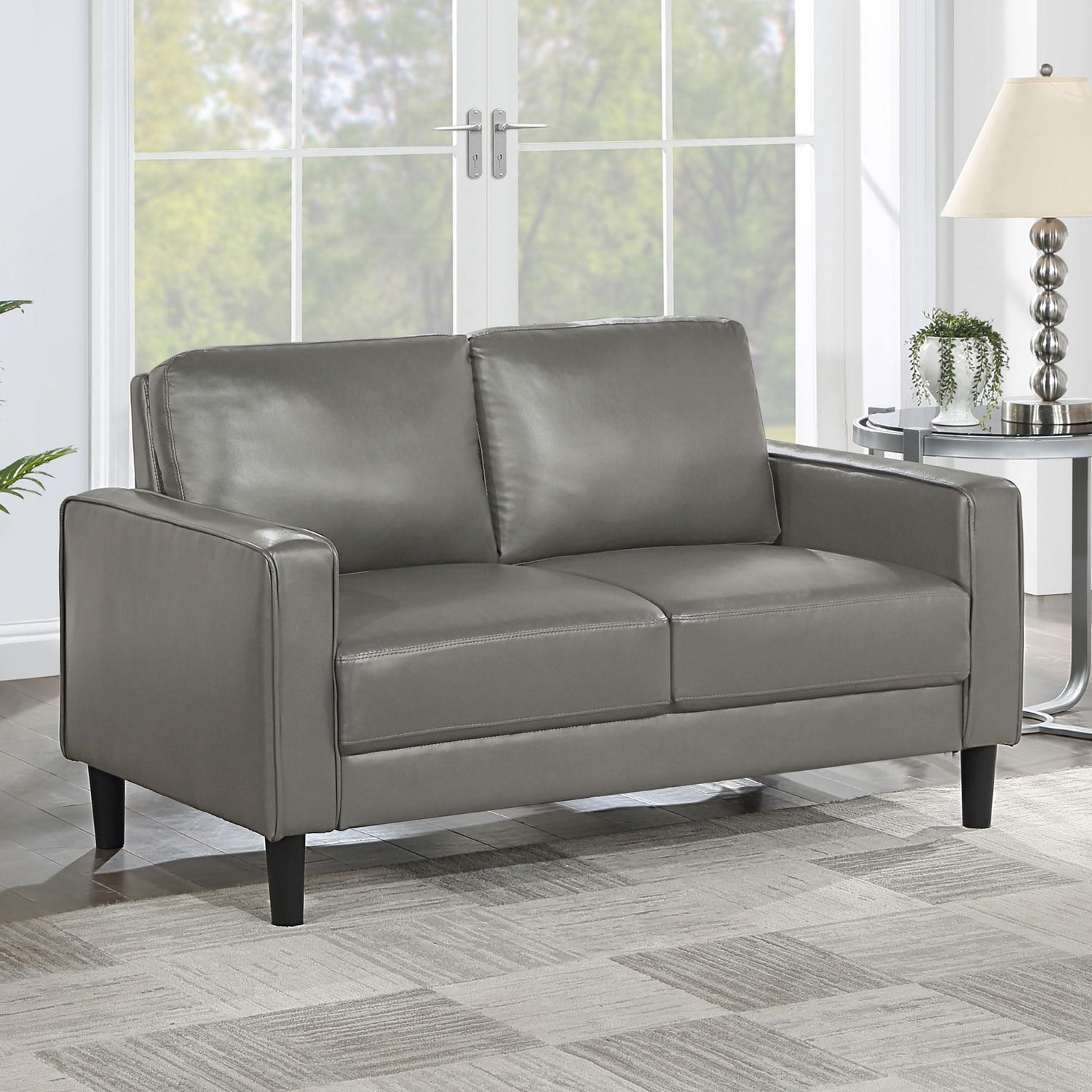 Details: Designed for comfort and style, this gray loveseat features sleek track arms, cozy seats, and a compact profile perfect for any space-saving need. Wrapped in smooth faux leather upholstery, it offers foam-filled cushions, a sinuous spring deck, and a webbed back for lasting support. Its modern silhouette pairs well with transitional style spaces, while the straight tapered legs add a clean finish. Whether in a living room or den, this upholstered loveseat fits seamlessly into your décor layout.