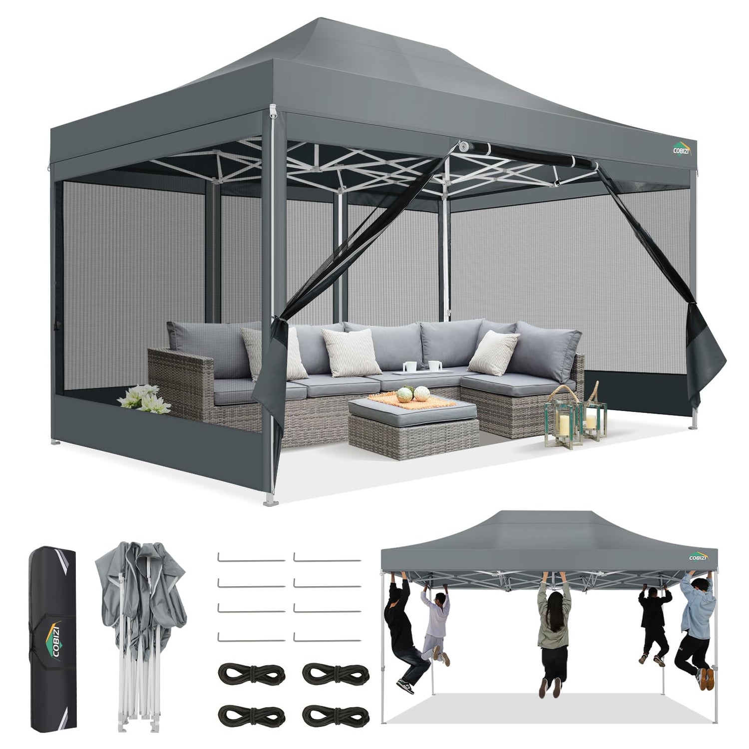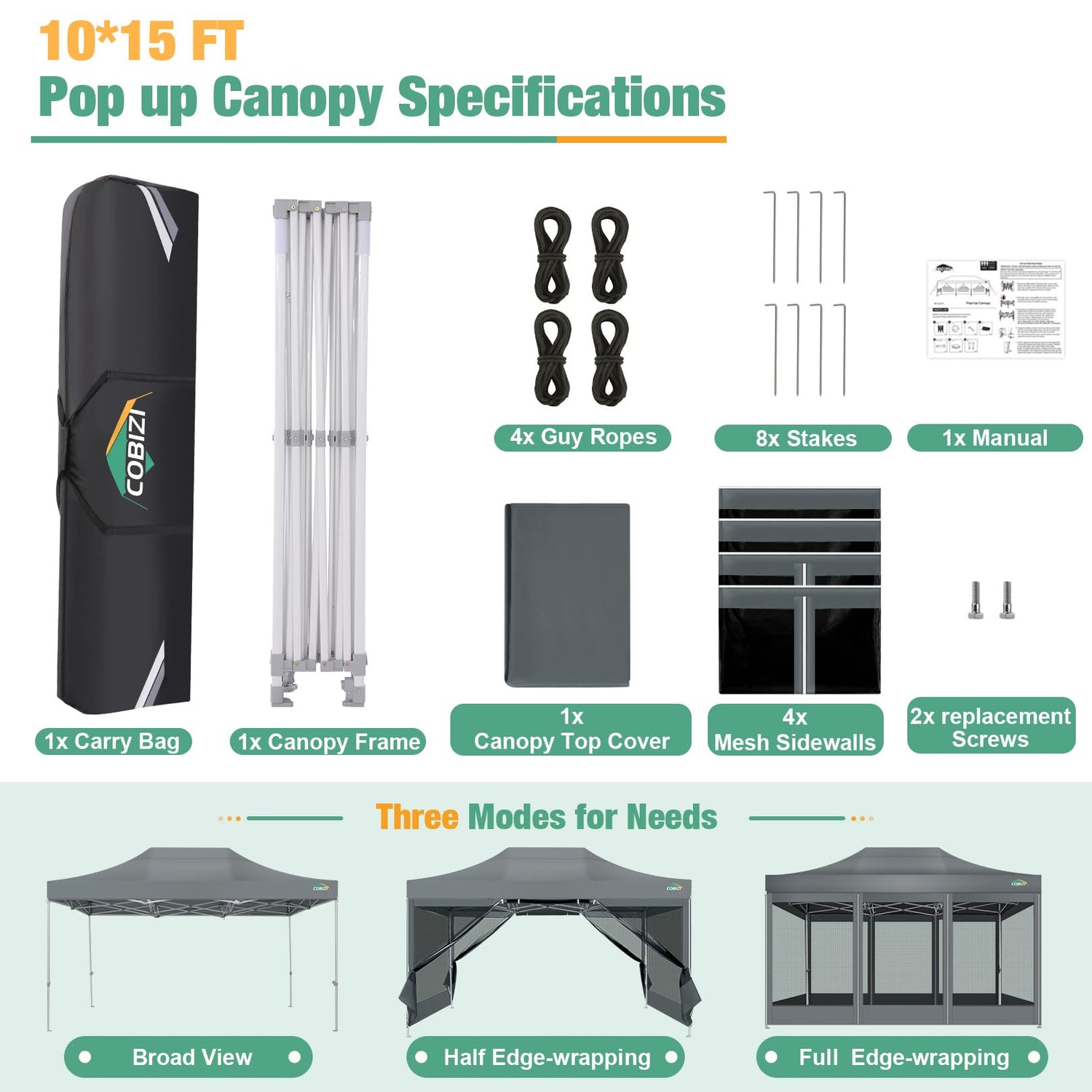 - Easy to Assemble & Portable: COBIZI 10x15 Pop up tent is easy to set up and pop up. Setting up and taking down this pop up screened tent only takes a minute for 2-3 people.The 10x15 commercial canopy tent comes with a 600D Oxford cloth carry bag for easy to move. Ideal for party, camping, beaches, craft show and farm.