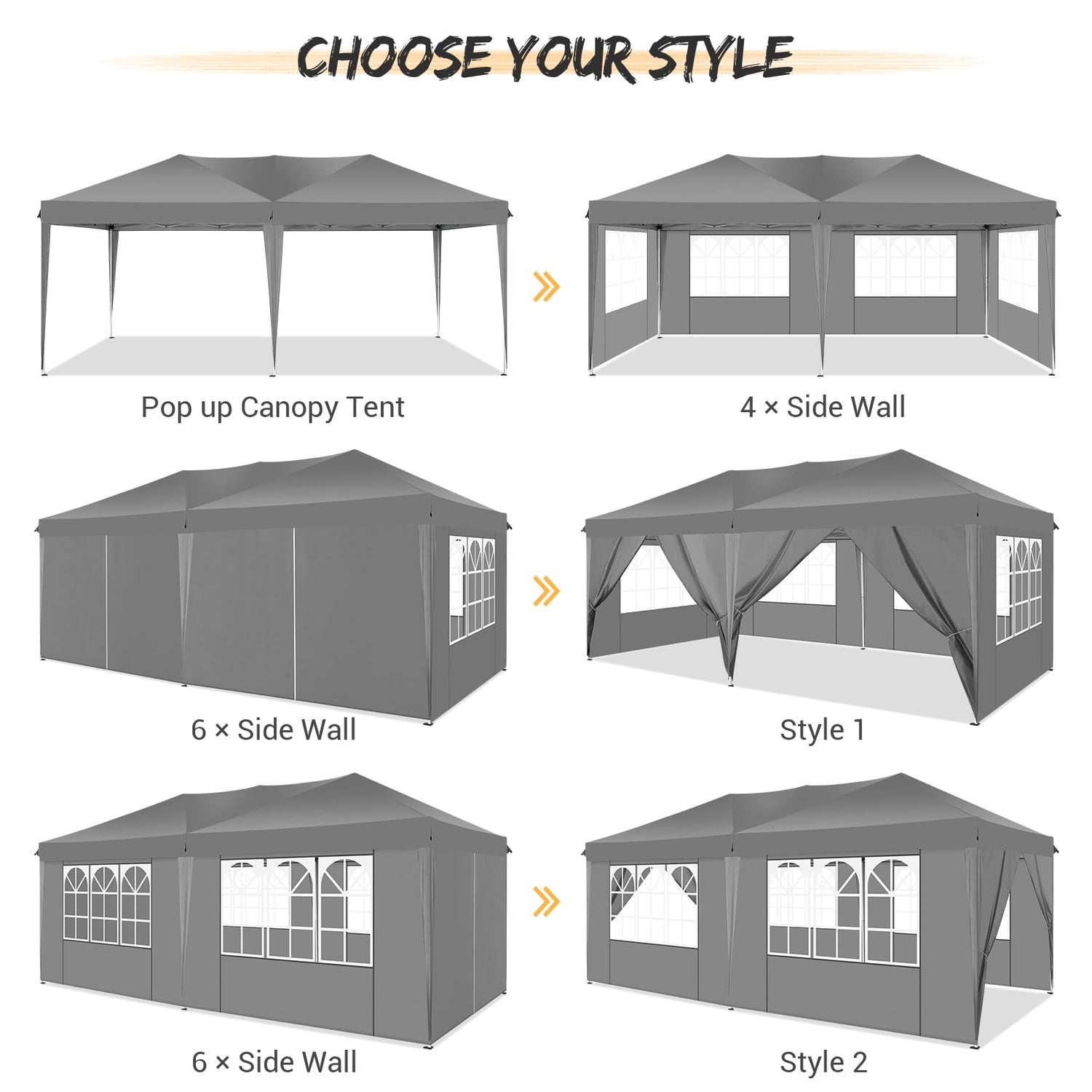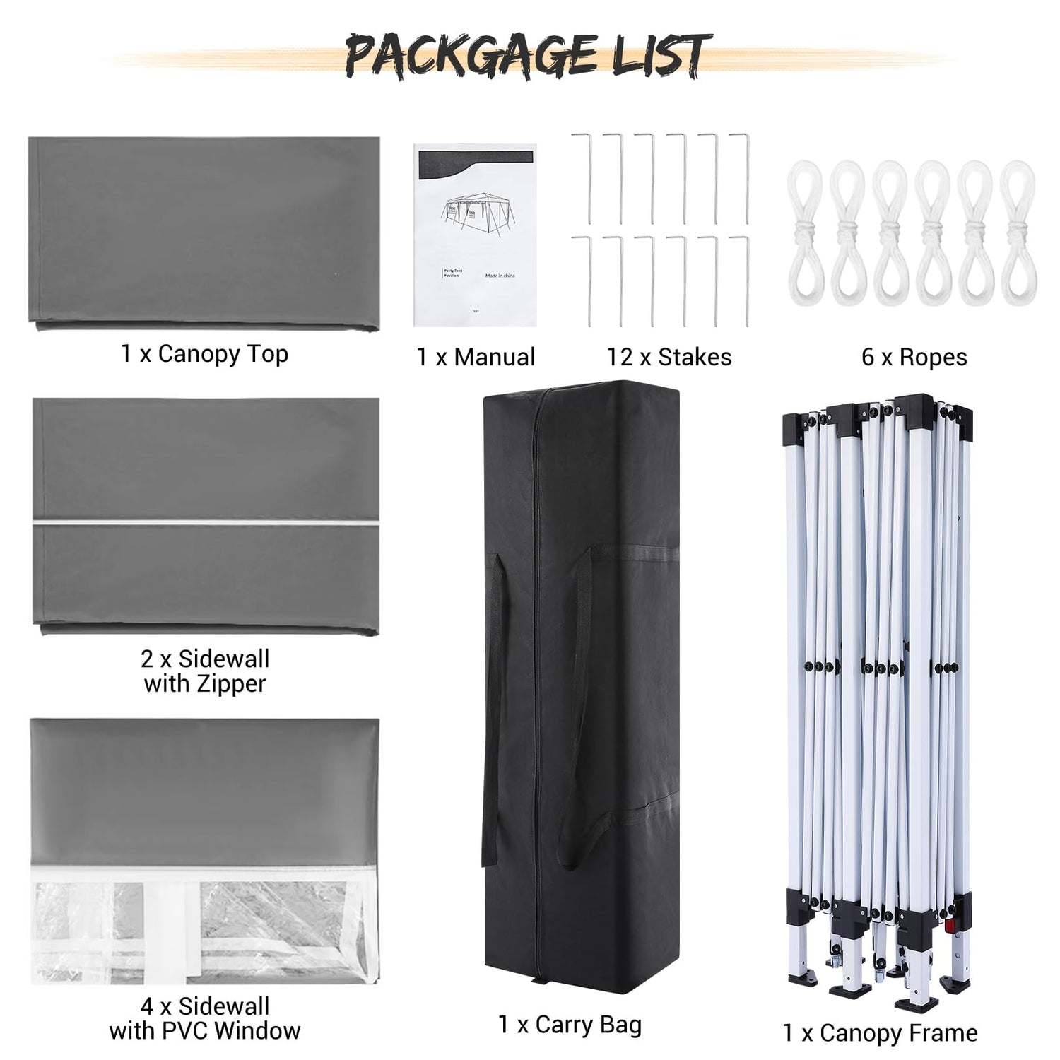 - [Package List]: 10'x20' Pop Up Canopy Frame + 10'x20' Canopy Top Cover + 2 Sun Wall with Zipper + 4 Sun Wall with Window + 600D Oxford Fabric Bag + 12xStakes + 4xRopes + Manual.