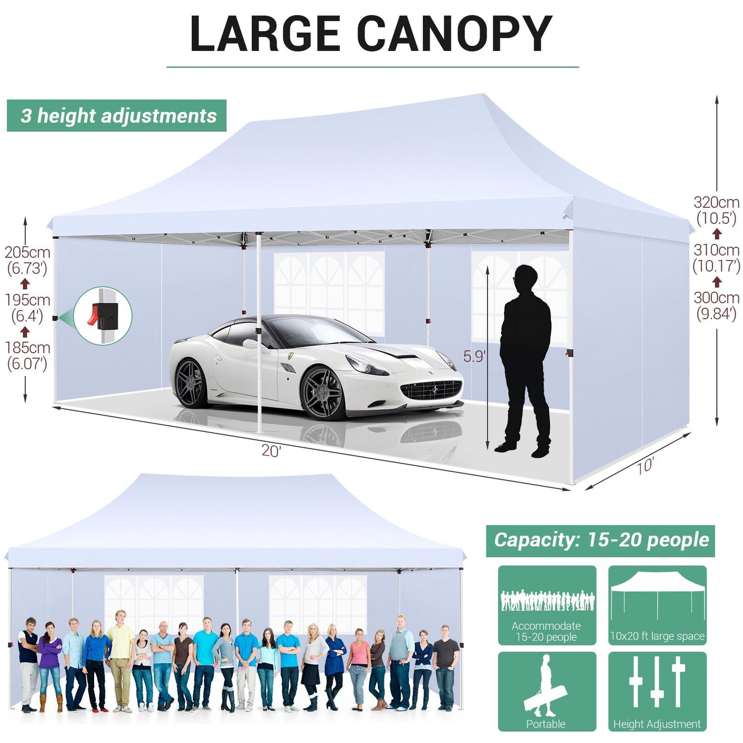 - 3 Height Options: The COBIZI 10x20 canopy with sidewall is height adjustable. You can adjust it as you need, from 300 cm to 310 cm to 320 cm, by simply pressing your thumb. The improved thumb lock system can be easily engaged and disengaged, protecting your fingers from pinching.