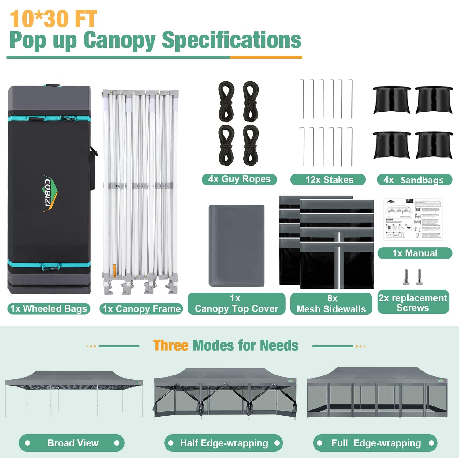 - Easy to Assemble & Portable: COBIZI 10x30 pop up tent is quick and easy to set up. It takes just a minute for 3-4 people to assemble or disassemble this pop up screen tent. The 10x30 commercial canopy tent includes a 600D Oxford cloth carry bag for easy transportation, making it ideal for parties, camping, beaches, craft shows, and farms. When not in use, simply fold the frame, sidewalls, and top neatly, and store everything in the carry bag for easy storage.