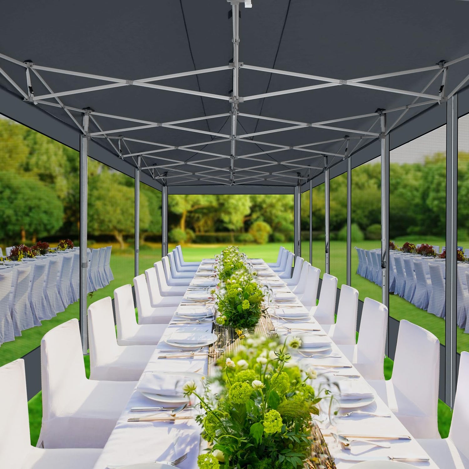 - Waterproof and Mosquito-Proof: This 10x30 Pop up gazebo features one top canopy and 8 removable mesh sidewalls. The 10x30 canopy tent is made from UV-resistant 420D Oxford fabric, blocking 99% UV rays. The canopy with PU coating and upgraded seam tapes ensure water resistance. The canopy with netting not only protects you from mosquitoes but also provides ventilation during the hot summer months.