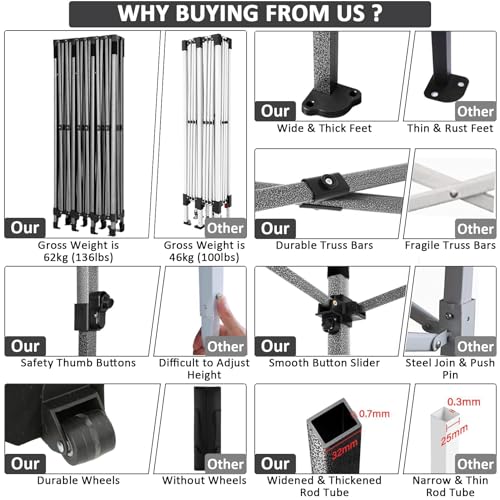 - 【Upgrade Heavy Duty Frame】10x30 pop up canopy tent heavy duty can hold 500kg. Sturdy and upgraded alloy steel frame structure, adding plastic parts at the point where the peaks and poles intersect. Pop up party tents heavy duty can bear the weight of 8-11 people at the same time. Powder coating ensures rust and corrosion resistance. 10x30 heavy duty pop up canopy can withstand up to level 4 wind/18mph, using the included sandbags, ropes and nails to increase the stability of the outdoor canopy.