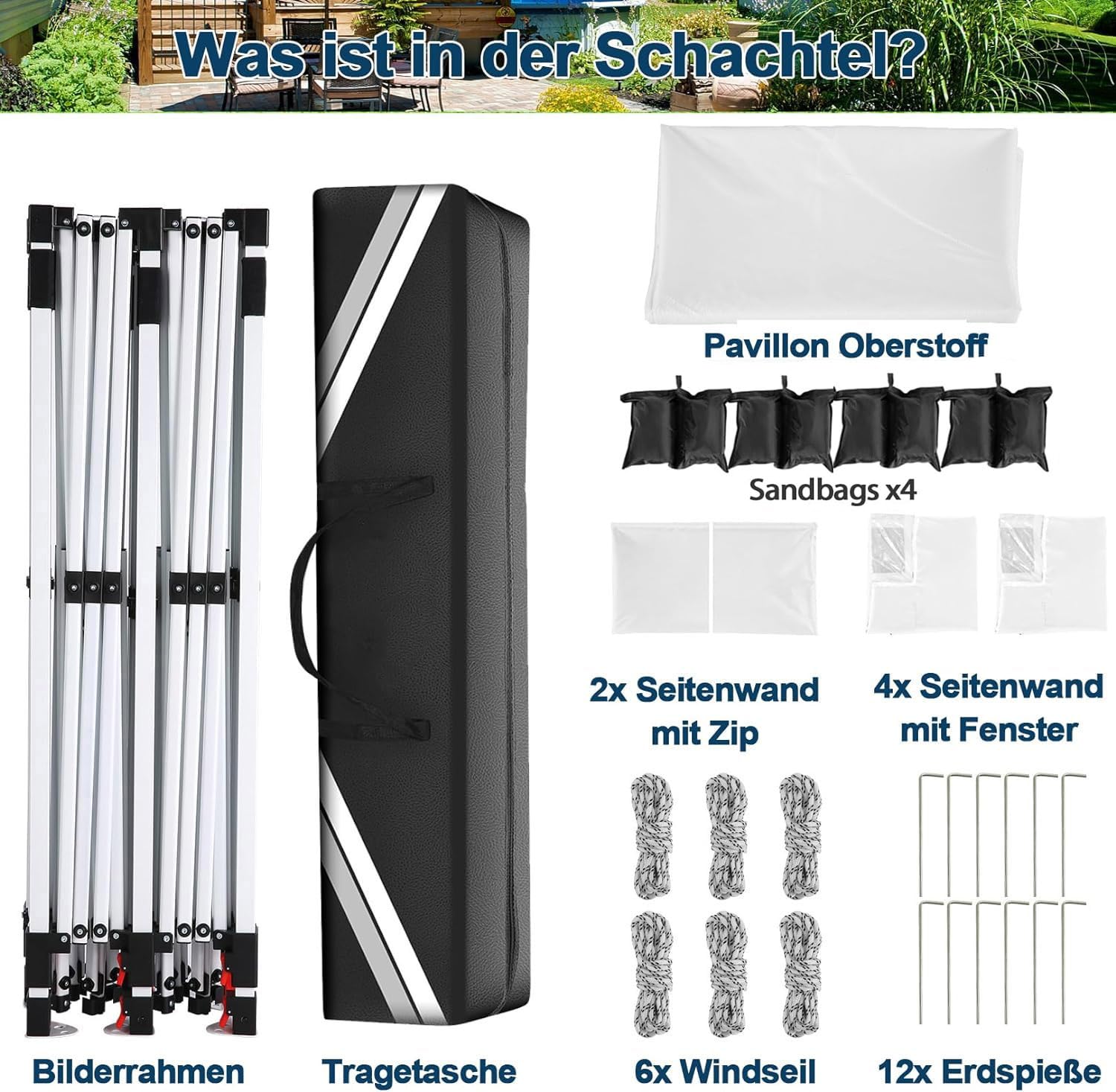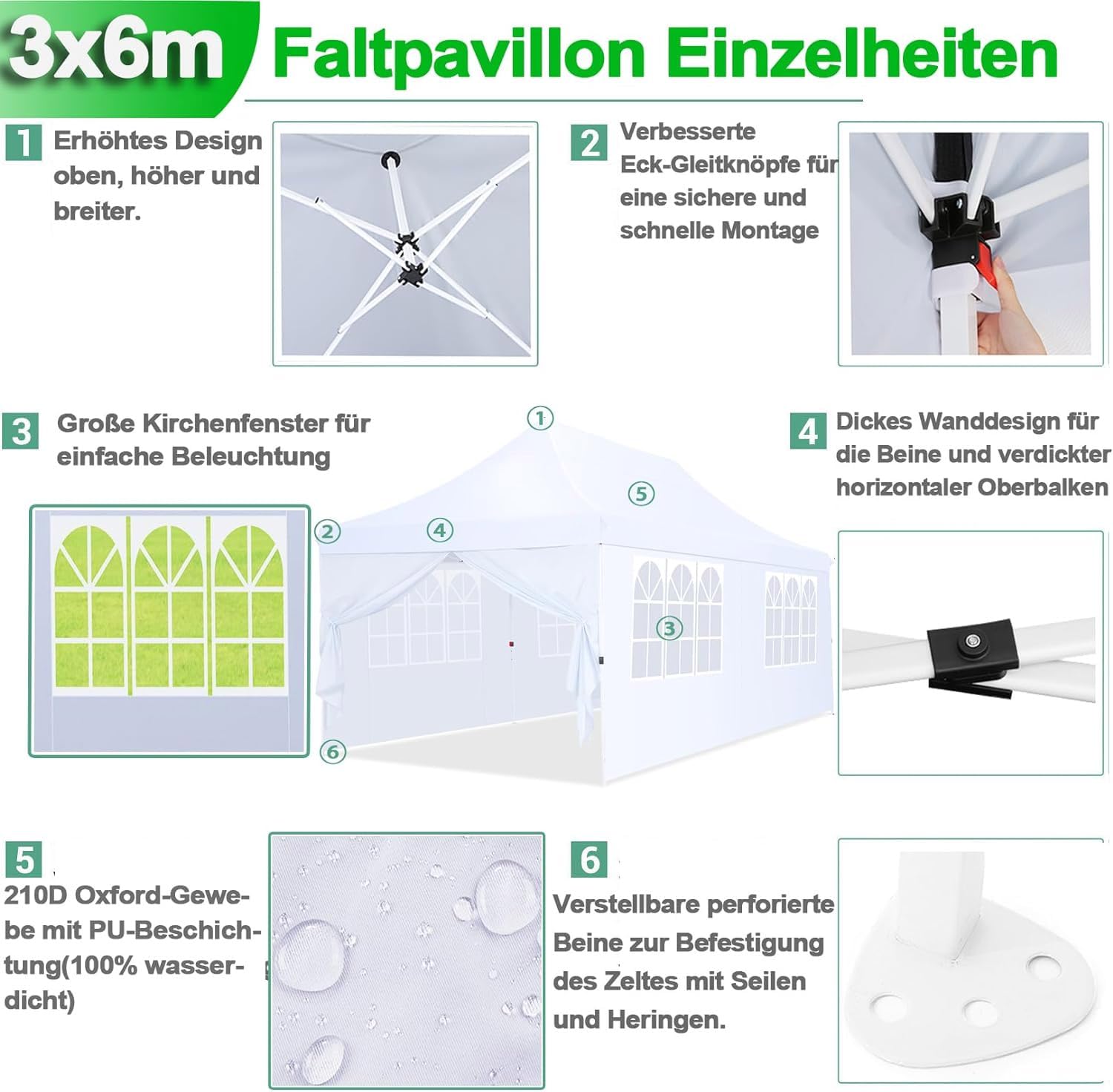 - [Package List]: 10x20 heavy duty canopy frame, 10x20 ft canopy top tarpaulin, 6 removable oxford cloth side walls, 4 sandbags, 1 handbag, 12 tent stakes and 4 ropes.Use ground pegs and ropes to make the party tent more stable.We offer a 1-year after-sales protection for your peace of mind, ensuring your satisfaction with our product.
