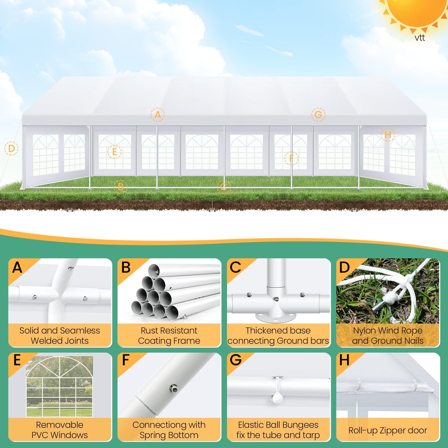 - 【20x40 FT Extra Large Size & Versatile Usage】20x40 tent can hold up to an estimated 50 people tents for parties, or weddings, and can also be used as a carport or outdoor storage tent. 20x40 party tent straight leg design and cathedral style roof offers an open-air feel for a variety of outdoor activities. Party tents 20x40 heavy duty waterproof great for tent party, outdoor events, outdoor shelter.