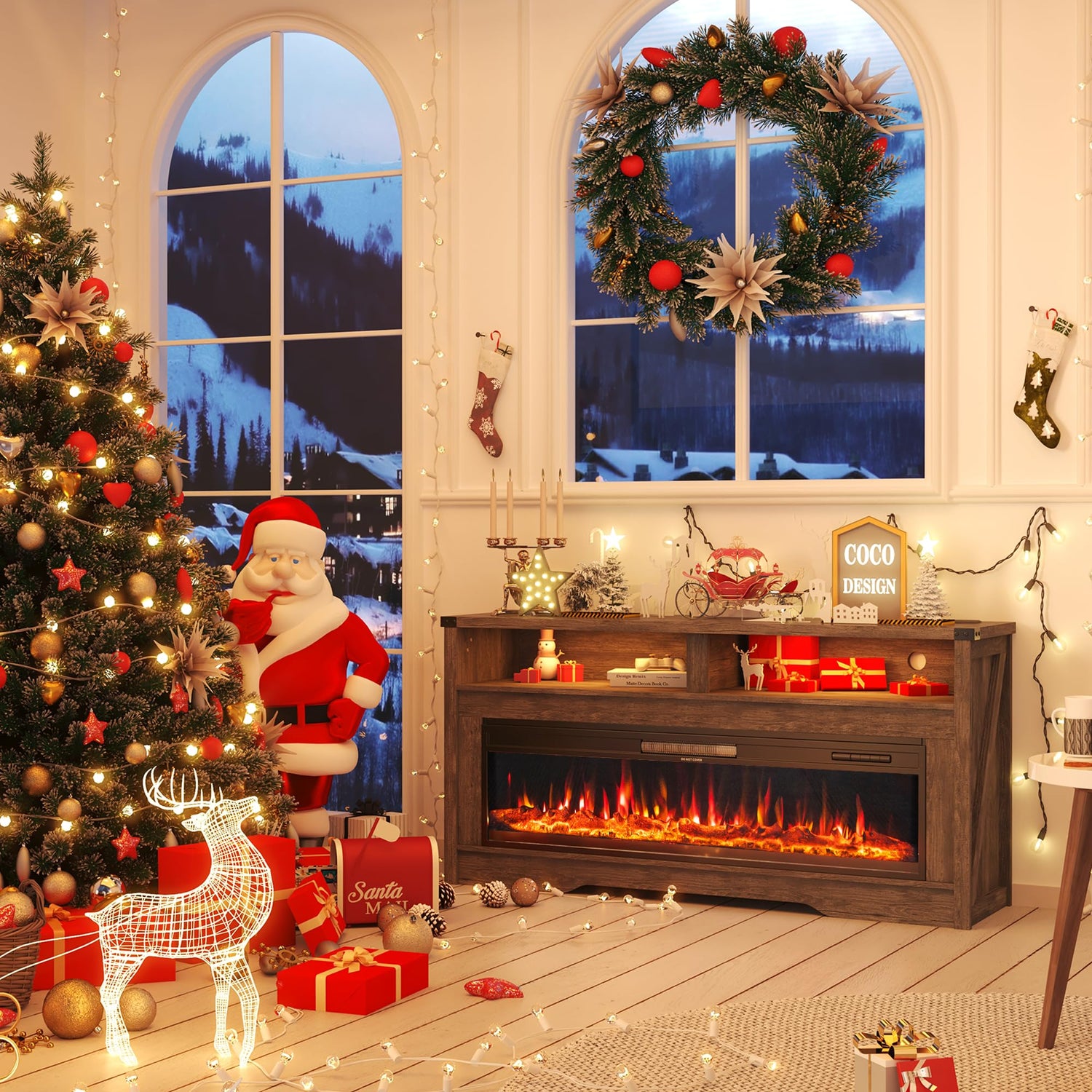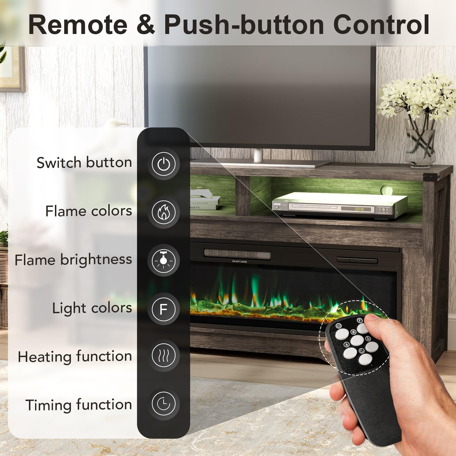 - Firewood Realistic Flame: 50'' Electric fireplace tv stand with 12 adjustable colors to make the flame effect realistic,5 flame brightness, heating and timing functions with overheat protection, safe to use with child and pet.