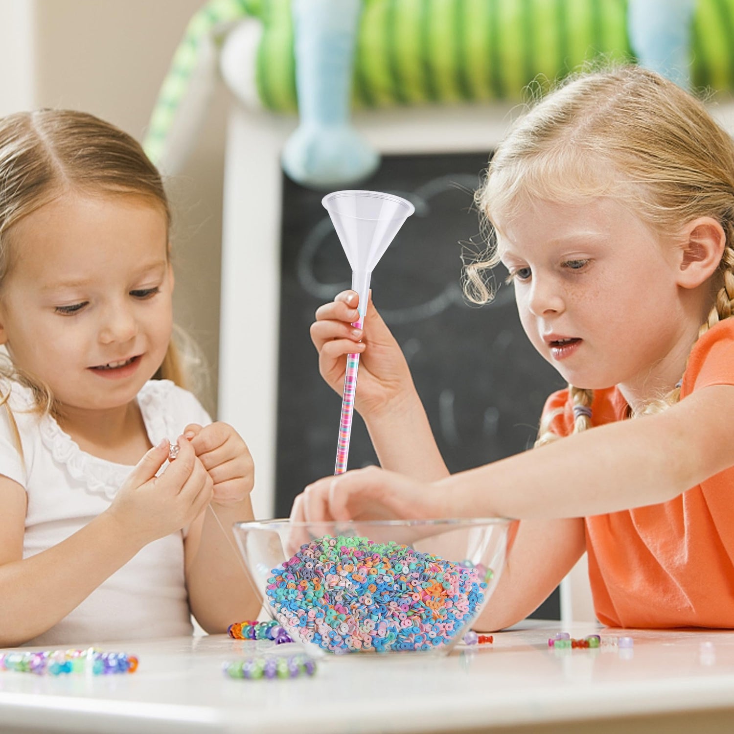 - Package Includes: You will receive 3 pcs beading funnels, 3 pcs beading needles, 3 pcs clips and 1 roll of 59ft crystal coil, specially designed for clay beads and the perfect tool for making bracelet jewelry.(Not Include Clay Beads)