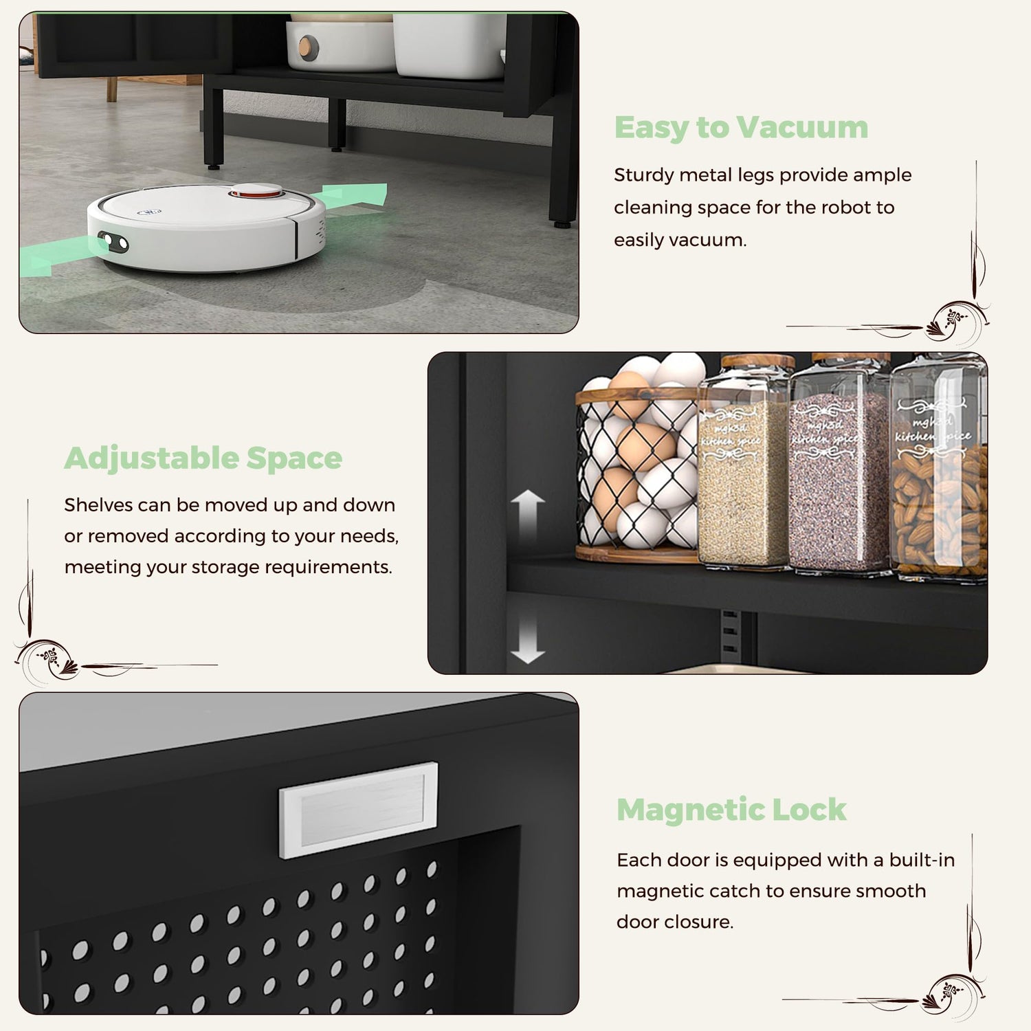 - Flexible Storage Options: The cabinet's adjustable shelves allow you to customize the space to fit a wide array of items, from kitchenware to pantry goods, making it a versatile storage solution.