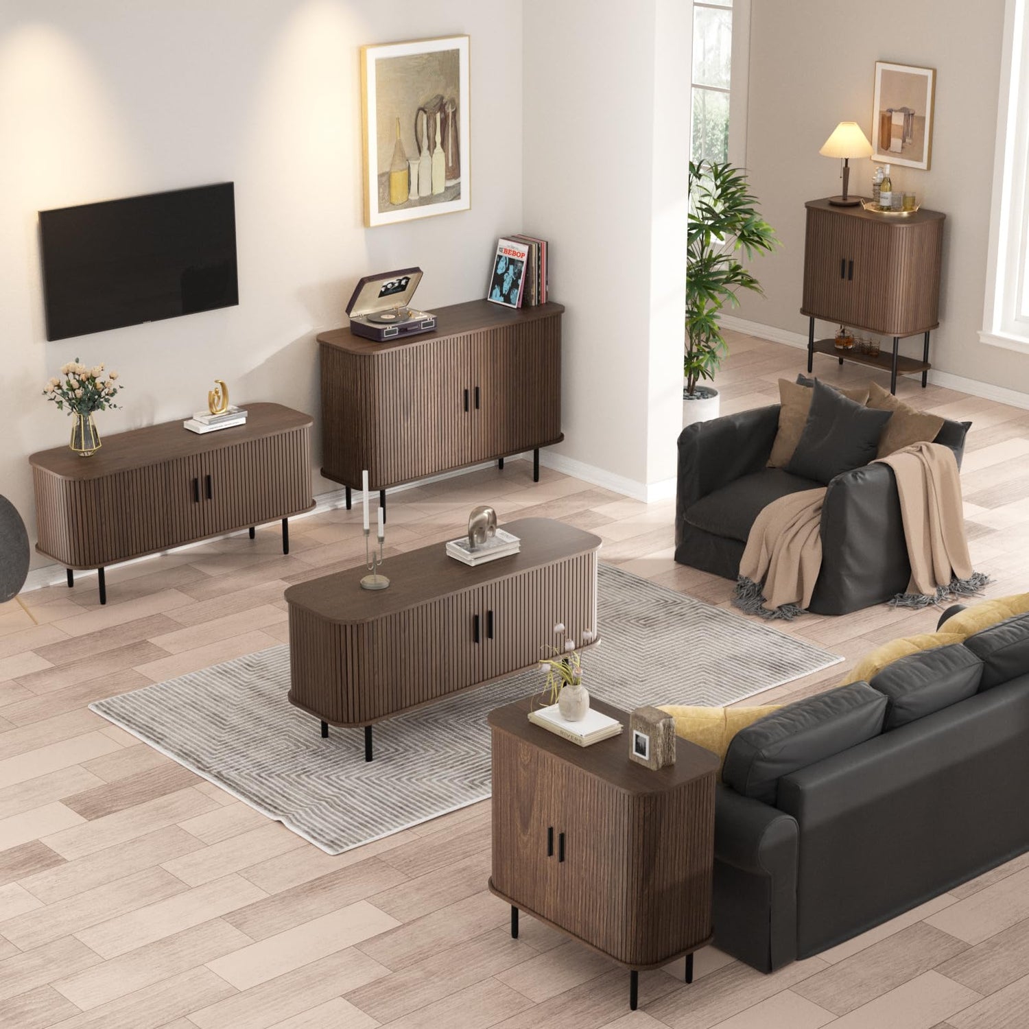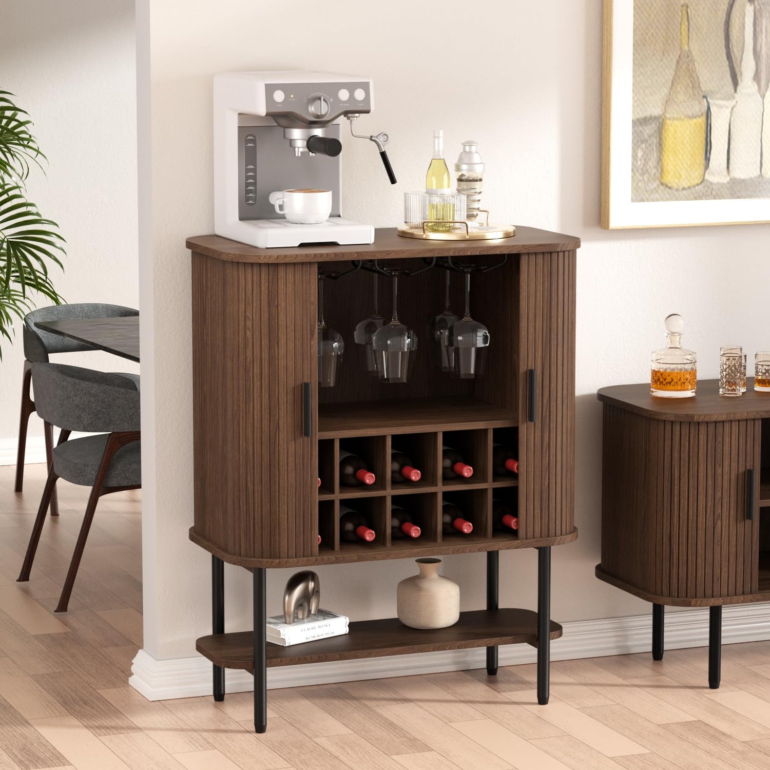 Coffee Bar Cabinet with Storage, Fluted Wine Cabinet with Sliding Doors, Glass Holder and Wine Rack, Buffet Sideboard Cabinet Liquor Cabinet for Kitchen, Dining Room, Living Room, Walnut