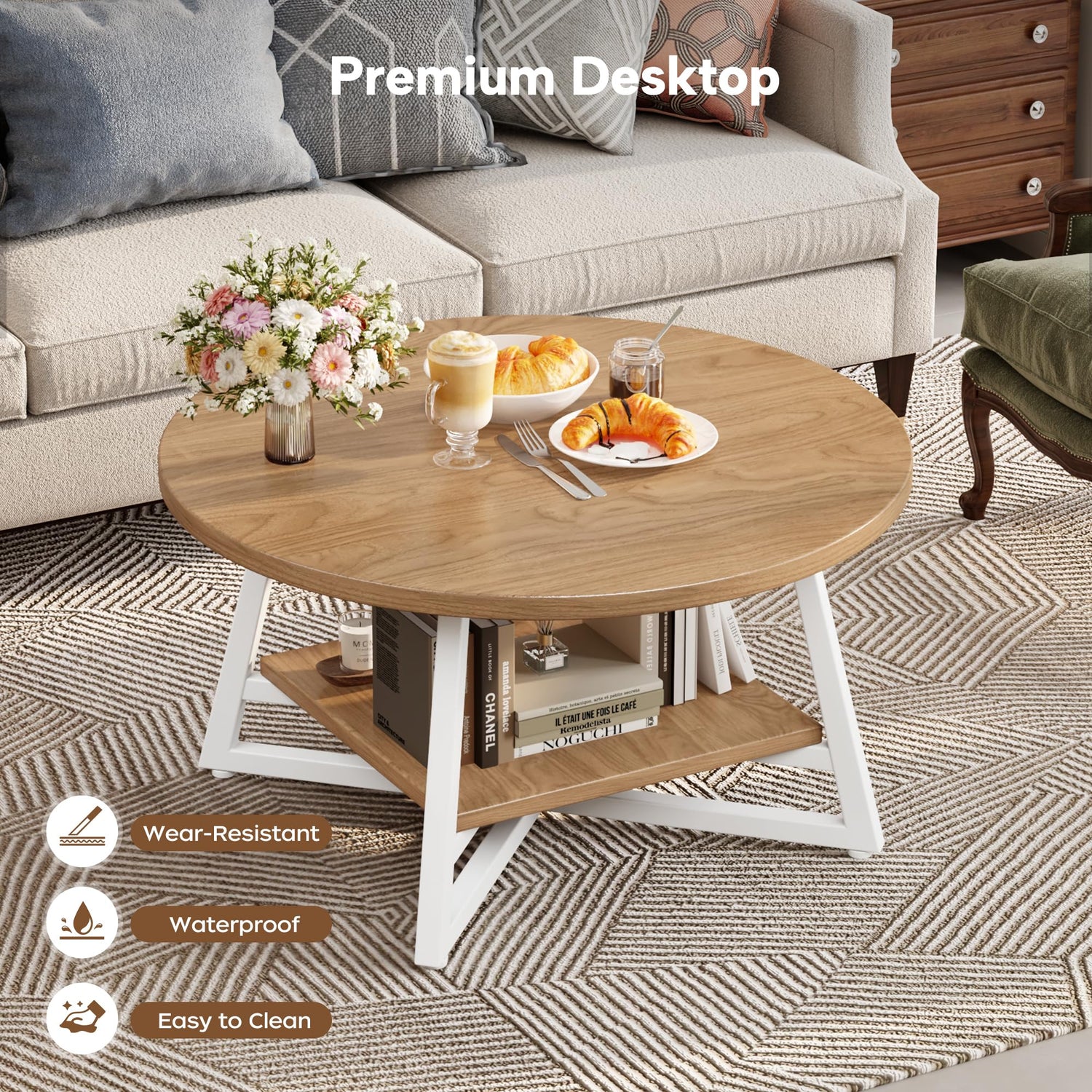 - 【2-Tiered Round Coffee Table】Overall Size: 28.7"D x 28.7"W x 18.1"H. This round coffee table features a 2 tier design, offering both a tabletop for immediate use and additional storage space. It's an ideal solution for keeping your living room essentials neatly arranged. The lower shelf is perfect for stashing away magazines, books, or toys, while the upper surface allows you to showcase your favorite decorative pieces or collectibles, adding a personal touch to your living area.