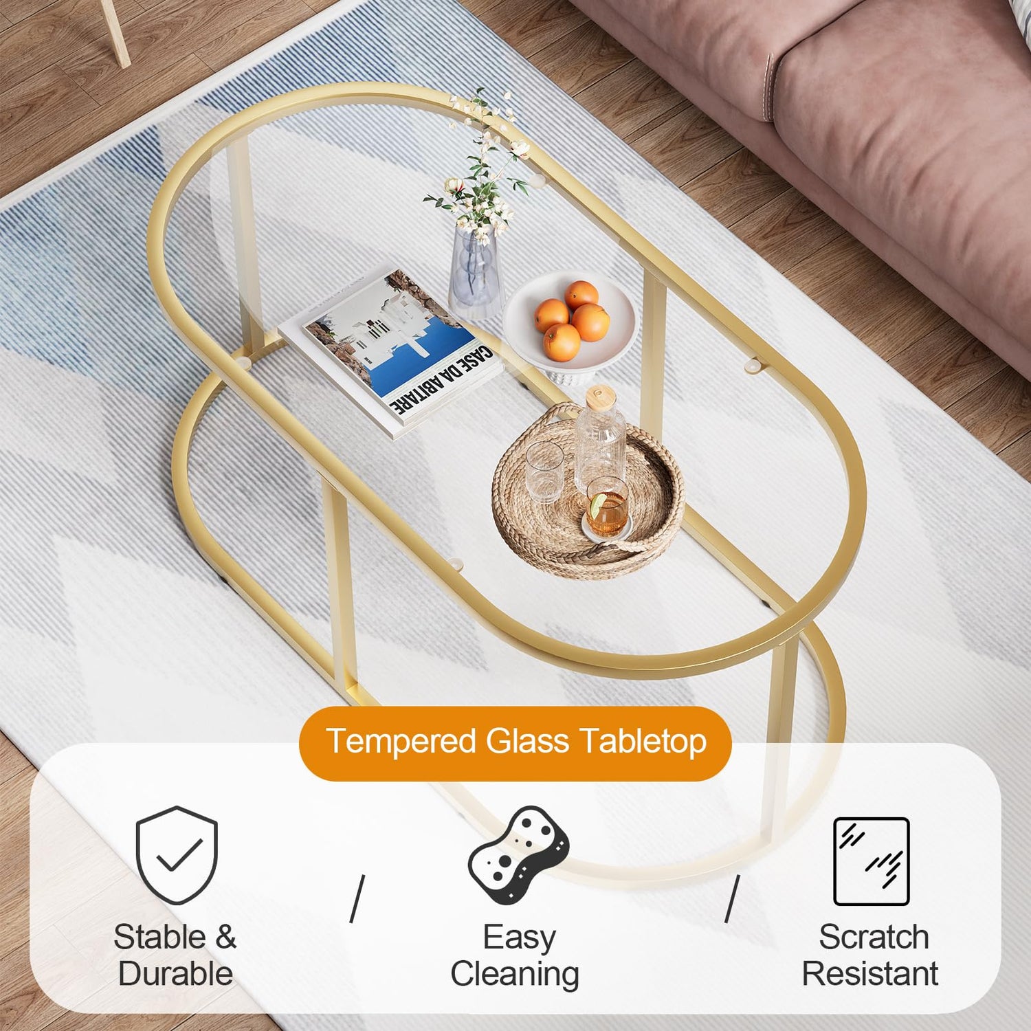 Coffee Table Gold Glass Coffee Tables for Living Room, Oval Table Center Table with Sturdy Metal Frame,Modern Tempered Glass Accent Tables for Bedroom Home Office