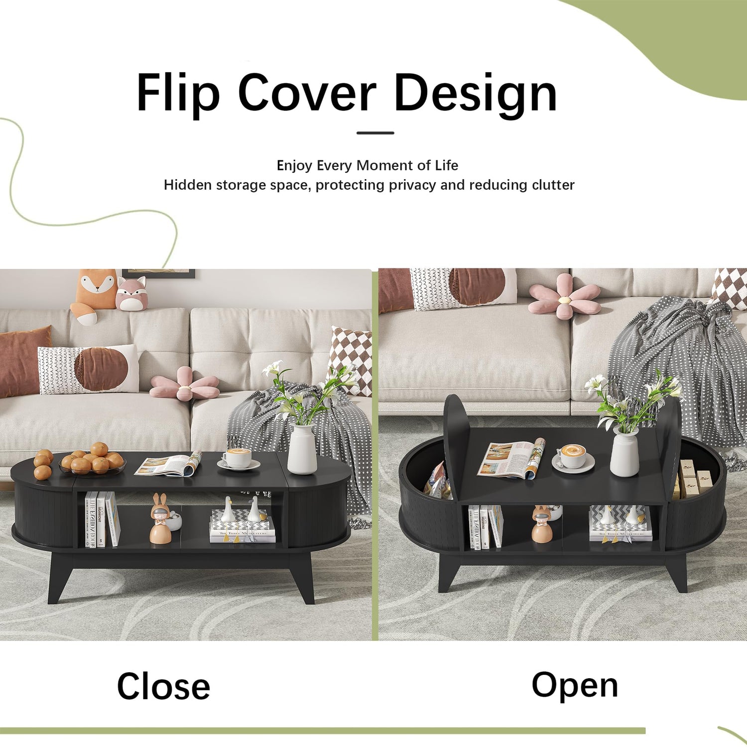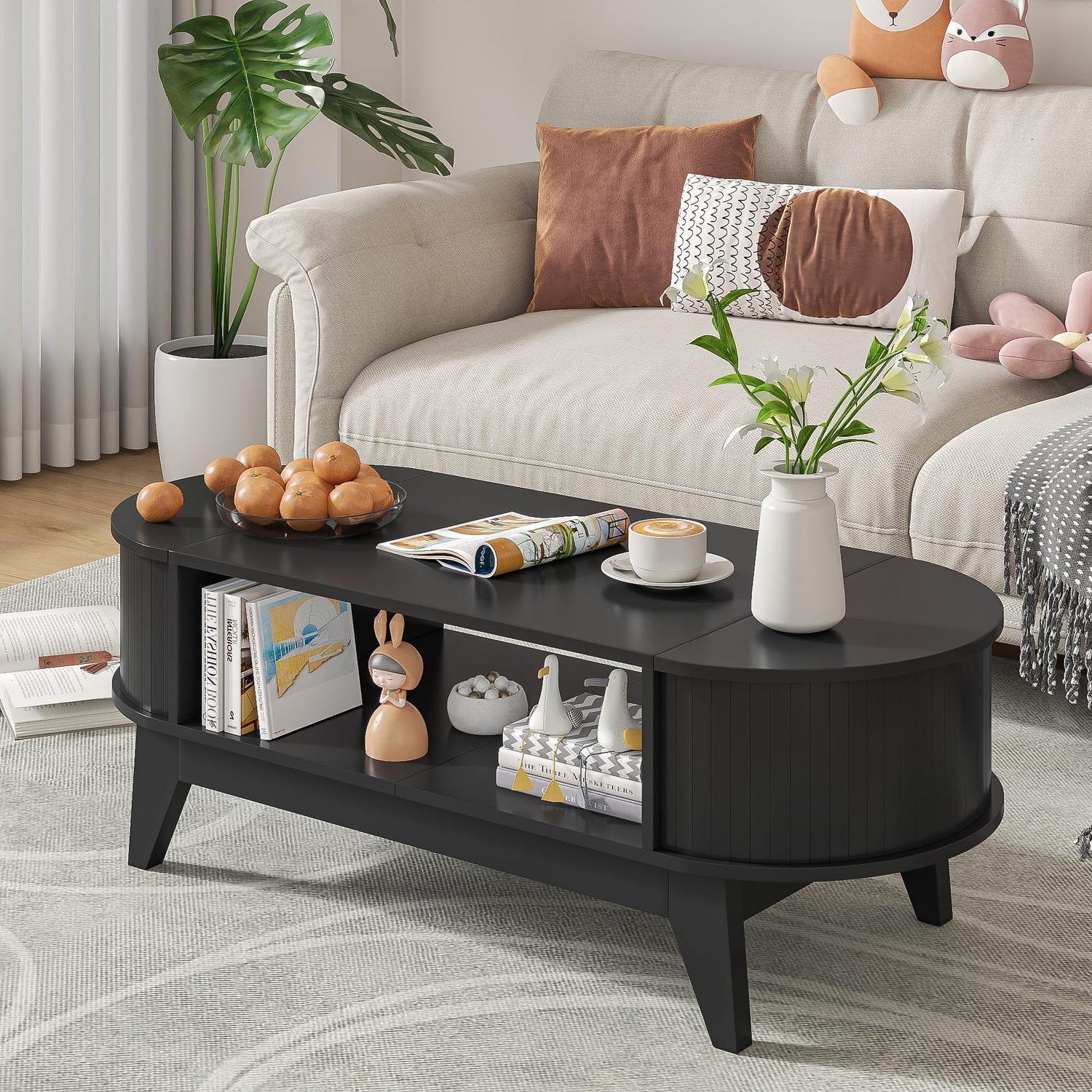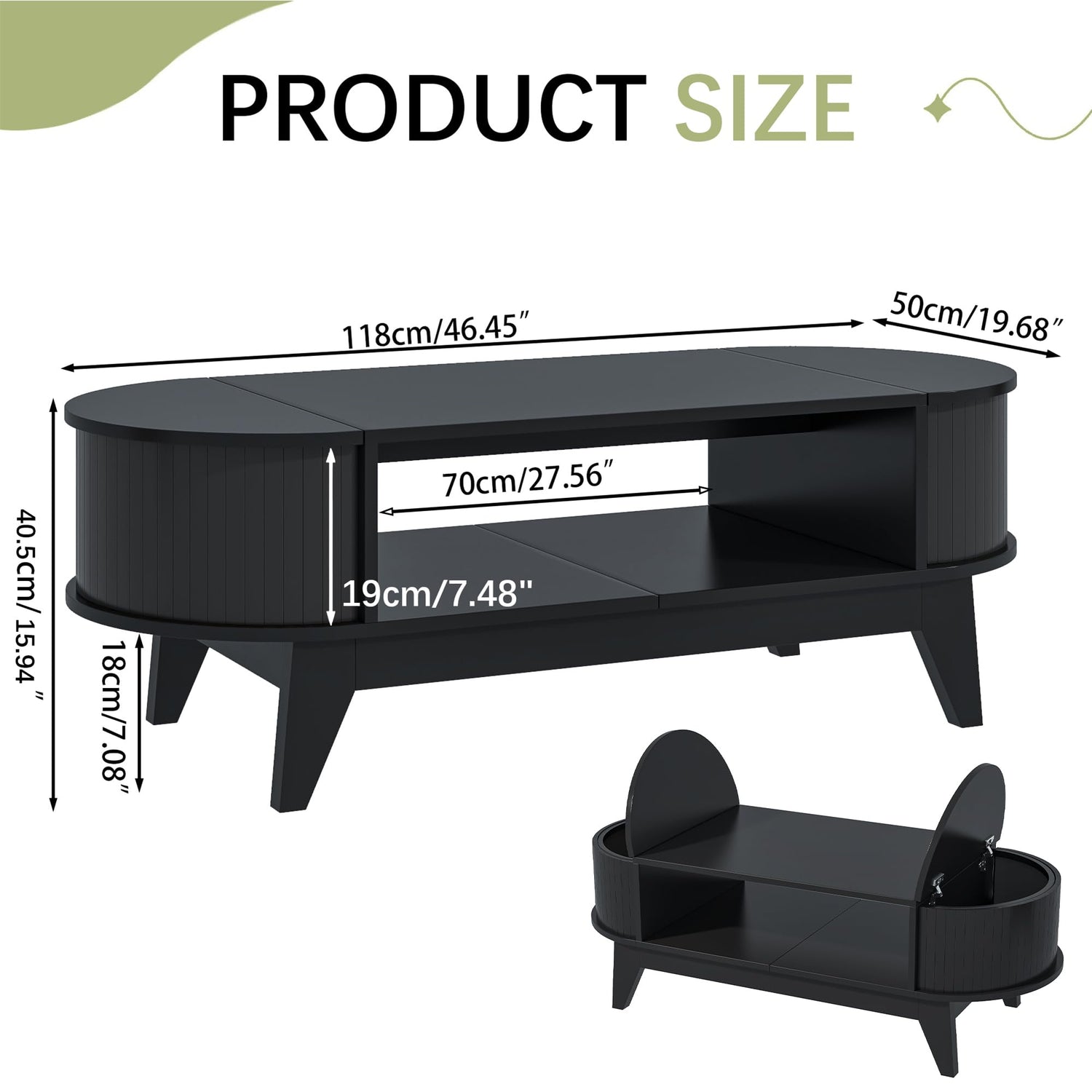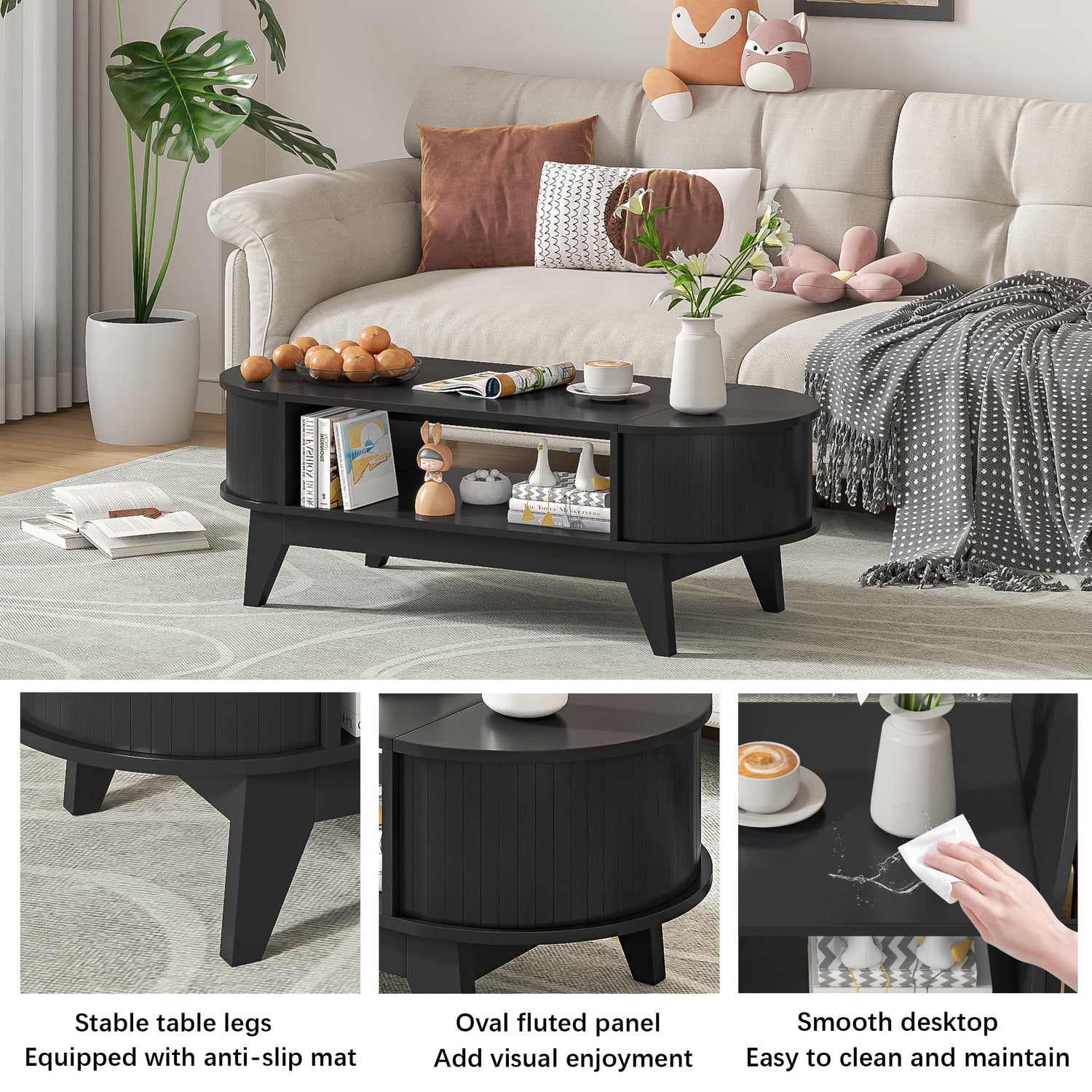 Coffee Table with 2 Hidden Storage,Mid Century Modern Coffee Table with Fluted Finish,Wood Center Tables Oval Coffee Tables with Flip-Top Lids for Living Room Home Office (Black)