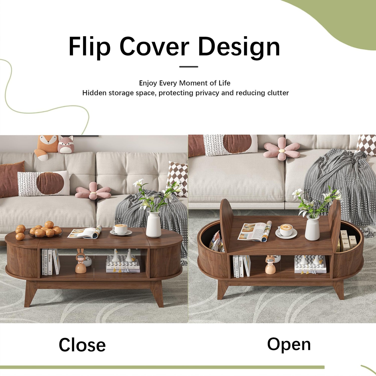 - 2 hidden flip storage spaces: coffee tables for living room have a hidden storage compartment on the left and right sides, providing you with extra space to store your blankets, snacks, toys, game consoles, etc., making it easy to store items Avoid clutter and protect your privacy at the same time. The coffee table also has a large open compartment to display your items, making your living room more tidy