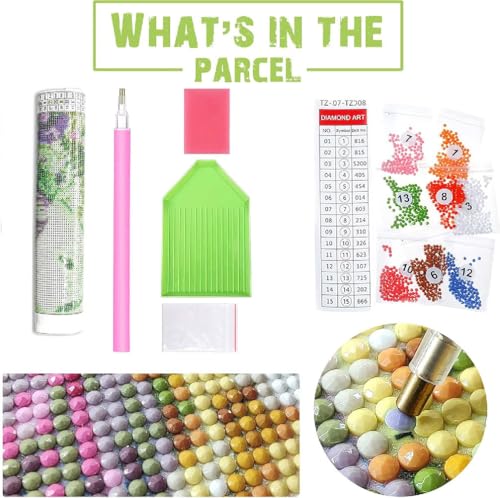 - Diamond Art Painting Kit: Our diamond Art painting kit includes everything you need to get started: a waterproof canvas * 1, a diamond pen * 1, replacement tip * 2, glue blocks * 2, a tray * 1, a self-sealing bag * 30, and over 30% of colorful round diamonds.