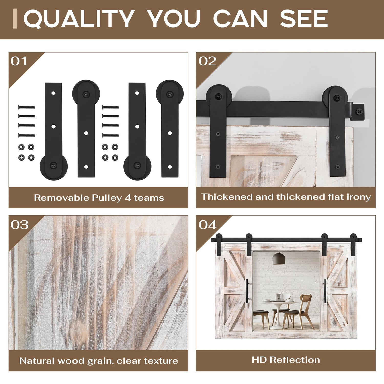 - QUALITY MATERIALS: This barn door mirror is carefully crafted with a durable antique solid wood frame and sturdy metal brackets. Equipped with a 4mm high-definition silver mirror inside, it provides crystal clear, distortion-free reflection, enhancing the light and depth of the space