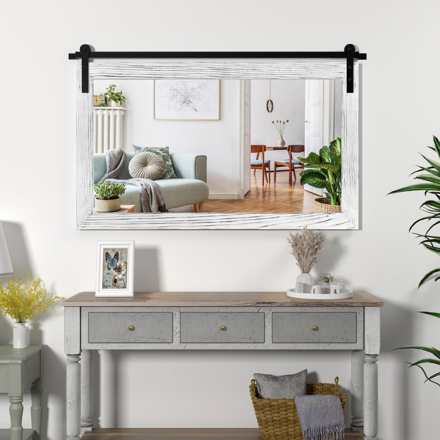 COGOOD Farmhouse Barn Door Mirror - 41" x 26" Rustic Wood Framed Wall Mirror for Bathroom, Living Room, Bedroom Wall Decor (White)