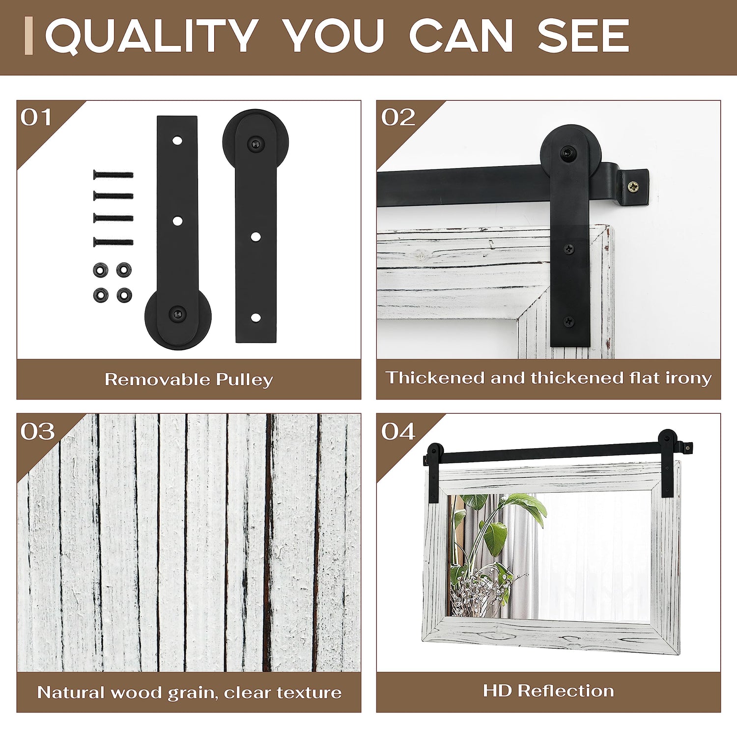 - QUALITY MATERIALS: The frame of the barn door mirror consists of an antique solid wood frame and a sturdy metal bracket. The interior features a 4mm HD silver mirror with clear and distortion-free reflections, providing a better sense of light and projection in your space