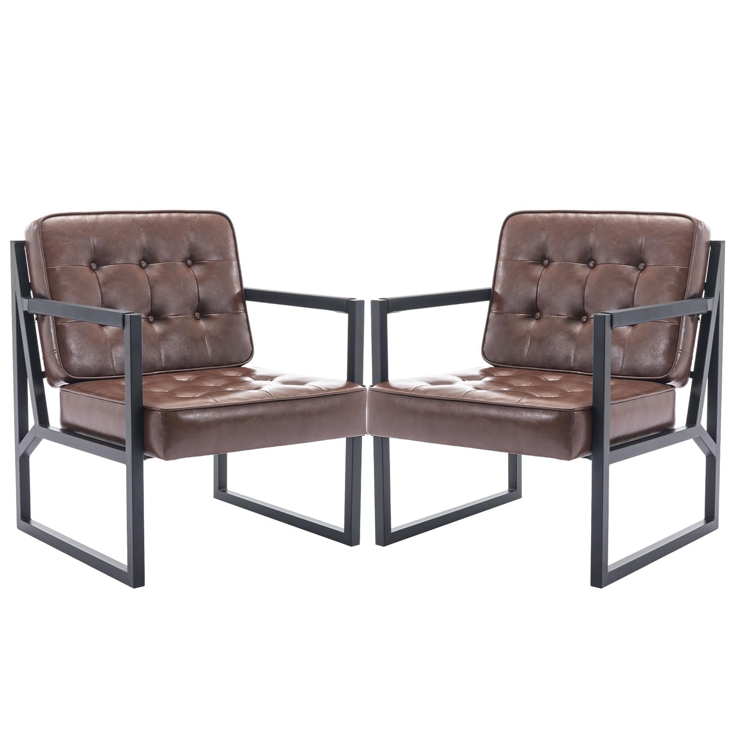COLAMY Mid Century Modern Accent Chair Set of 2, Comfy Living Room Chair, Brown Leather Accent Chair, Faux Leather Reception Armchair with Metal Legs for Living Room Bedroom Reception Office, Brown