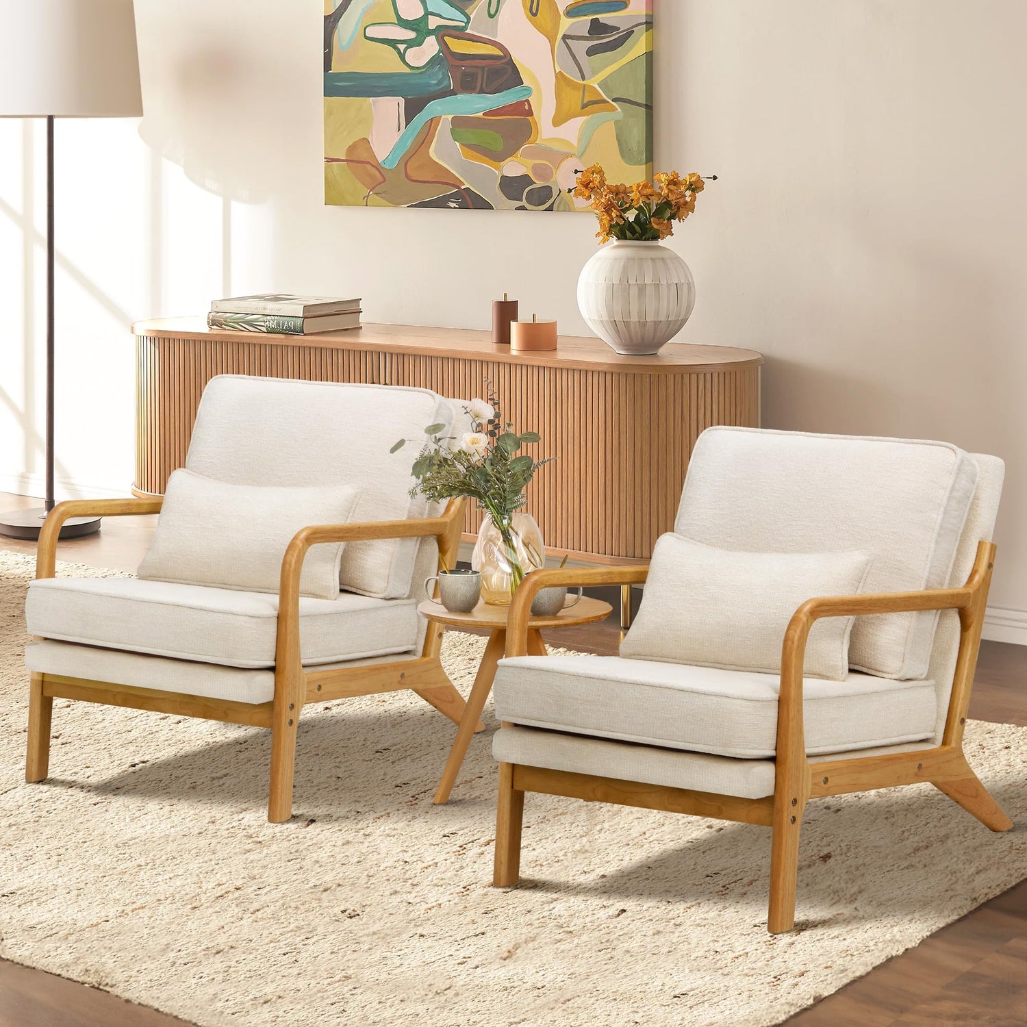 COLAMY Mid Century Modern Accent Chair Set of 2 with Lumbar Pillow, Relaxing Armchair with Solid Wood Frame & Soft Cushion, Reading Leisure Chair for Living Room(Beige)