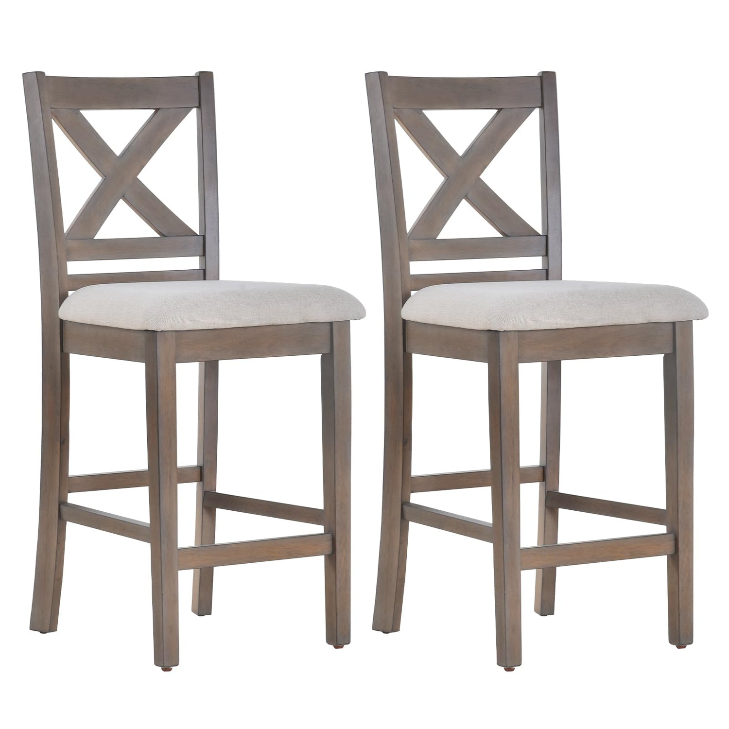 COLAMY Wooden Bar Stools Set of 2, Counter Height Bar Stools, Mid Century Modern Bar Stools with Backs, 25 Inch Upholstered Fabric Wooden Barstools for Kitchen Island Dining Room Bar, Light Brown Wash