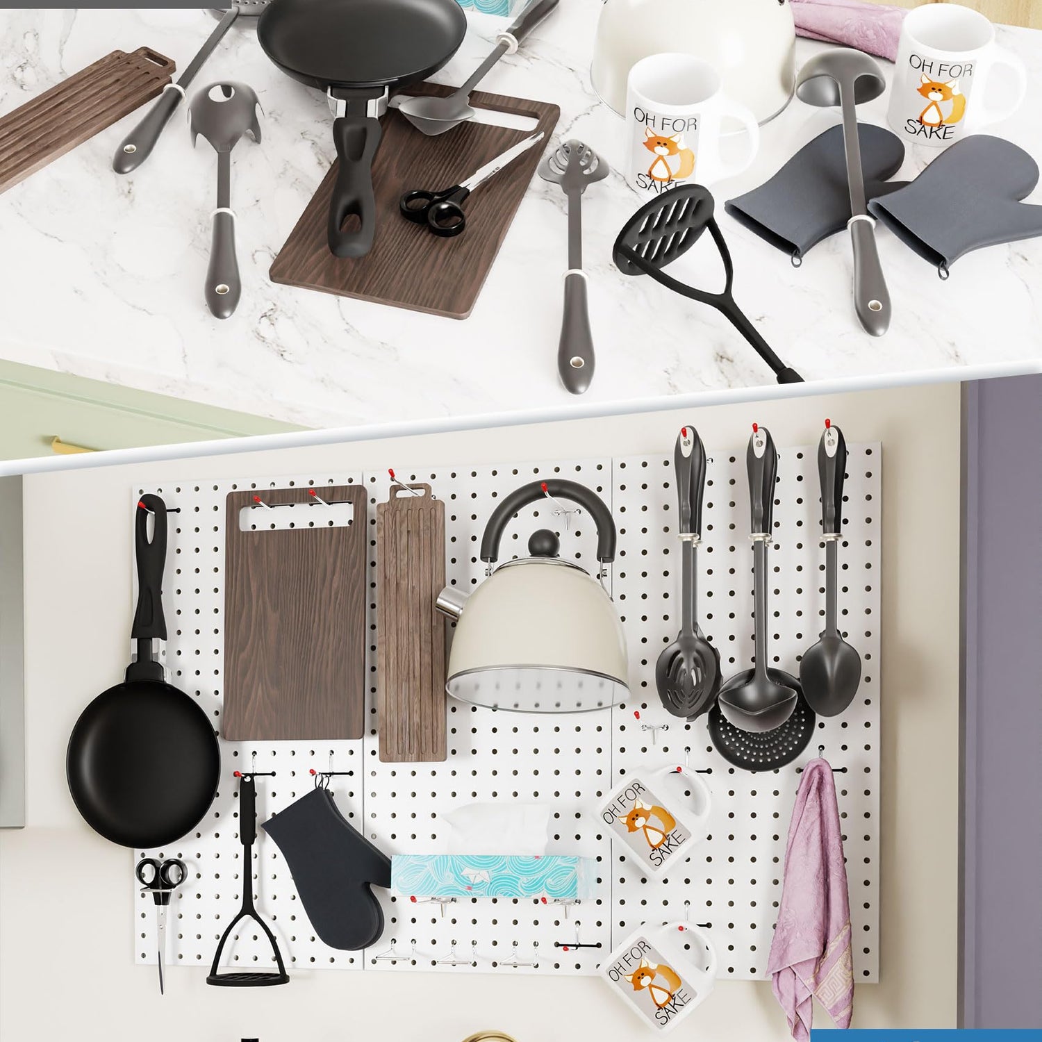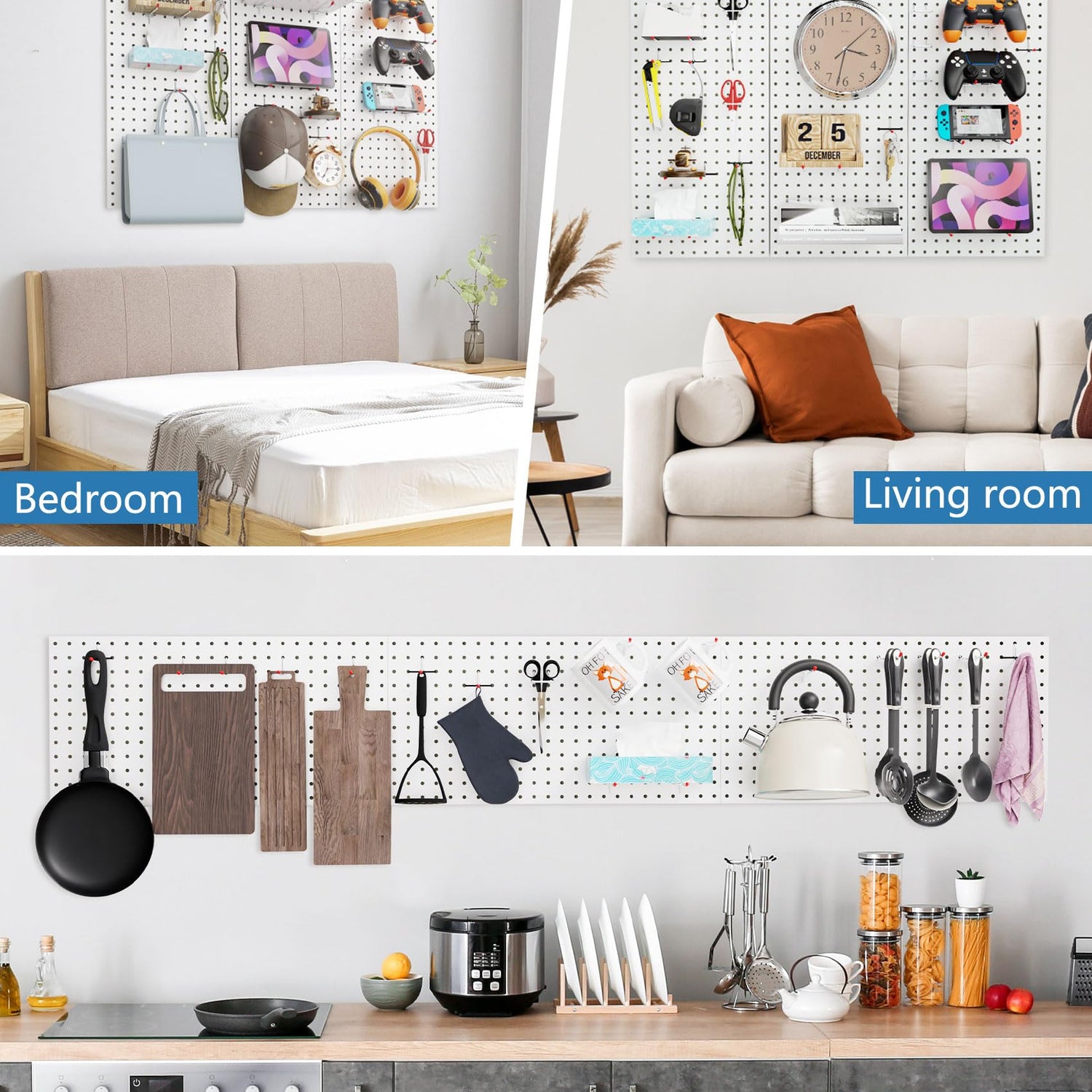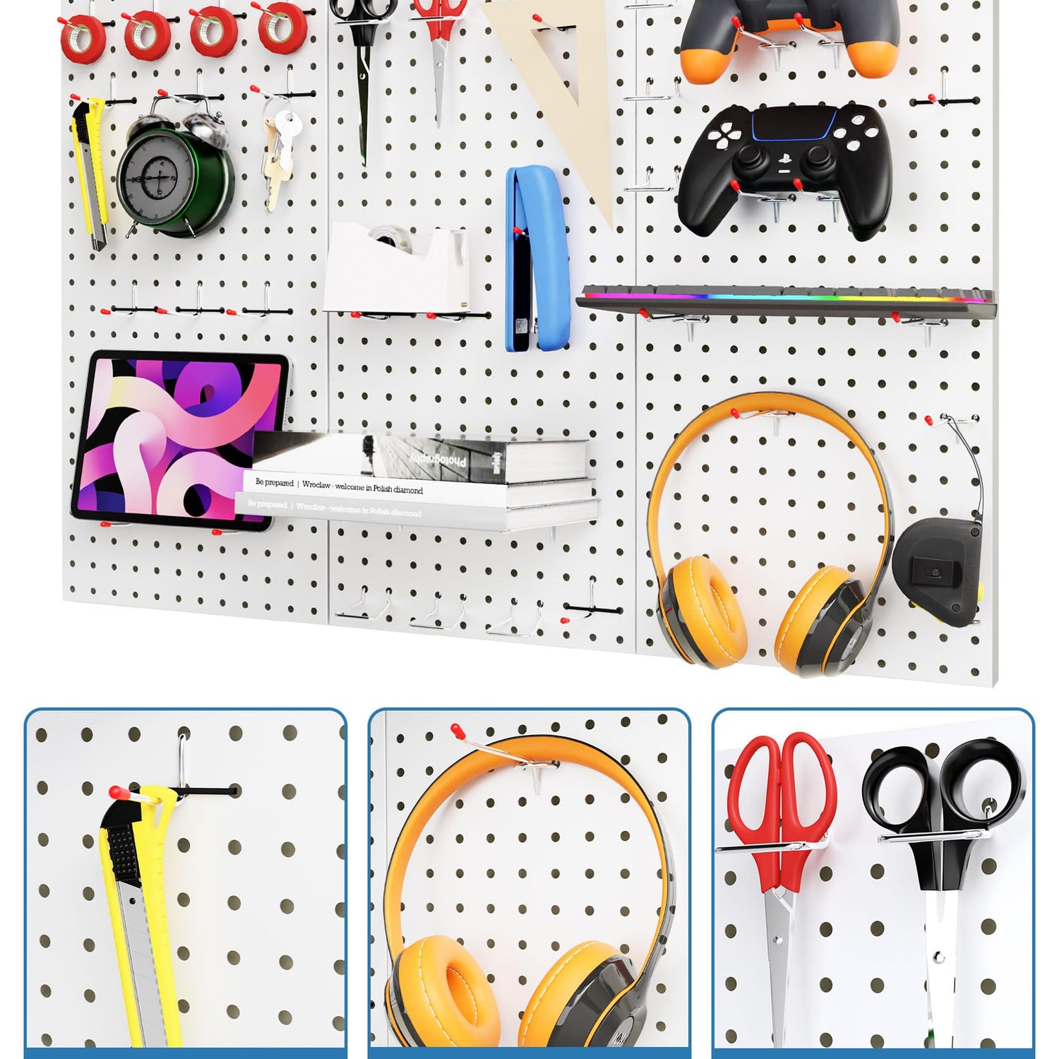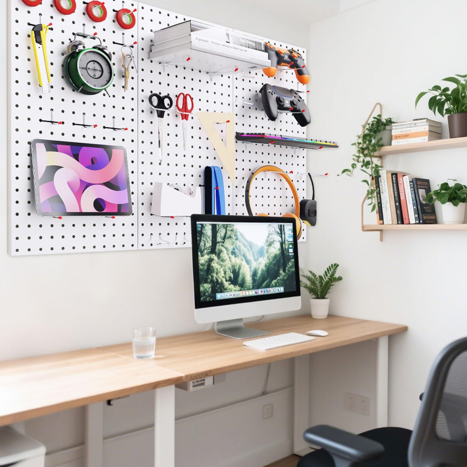 - Achieve Total Organization and Declutter Any Room:Reclaim your valuable desk and floor space! This pegboard kit provides efficient vertical storage for virtually anything: tools, craft supplies, kitchen utensils, office accessories, or gaming headsets. Keep everything visible and within reach to say goodbye to mess and boost your productivity.
