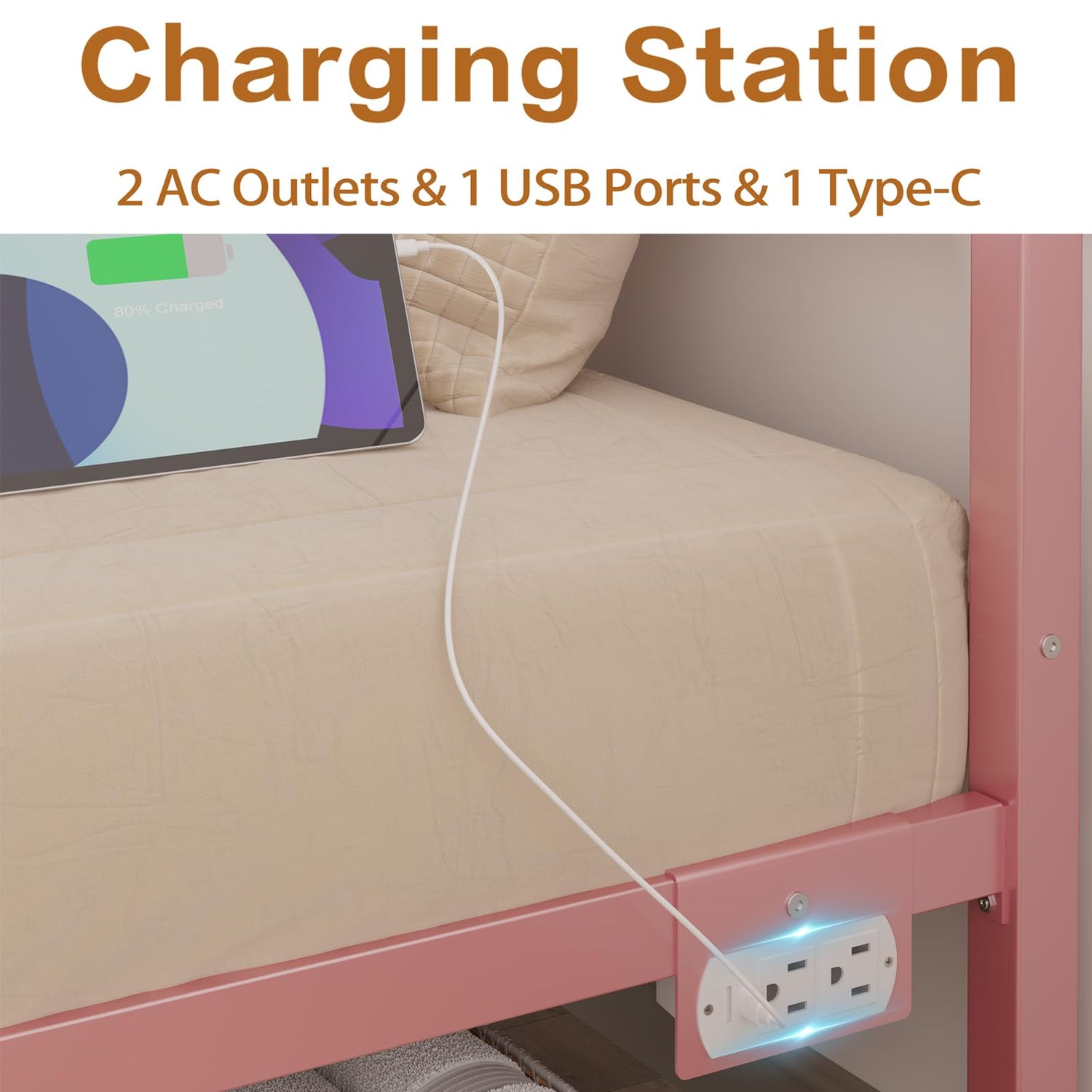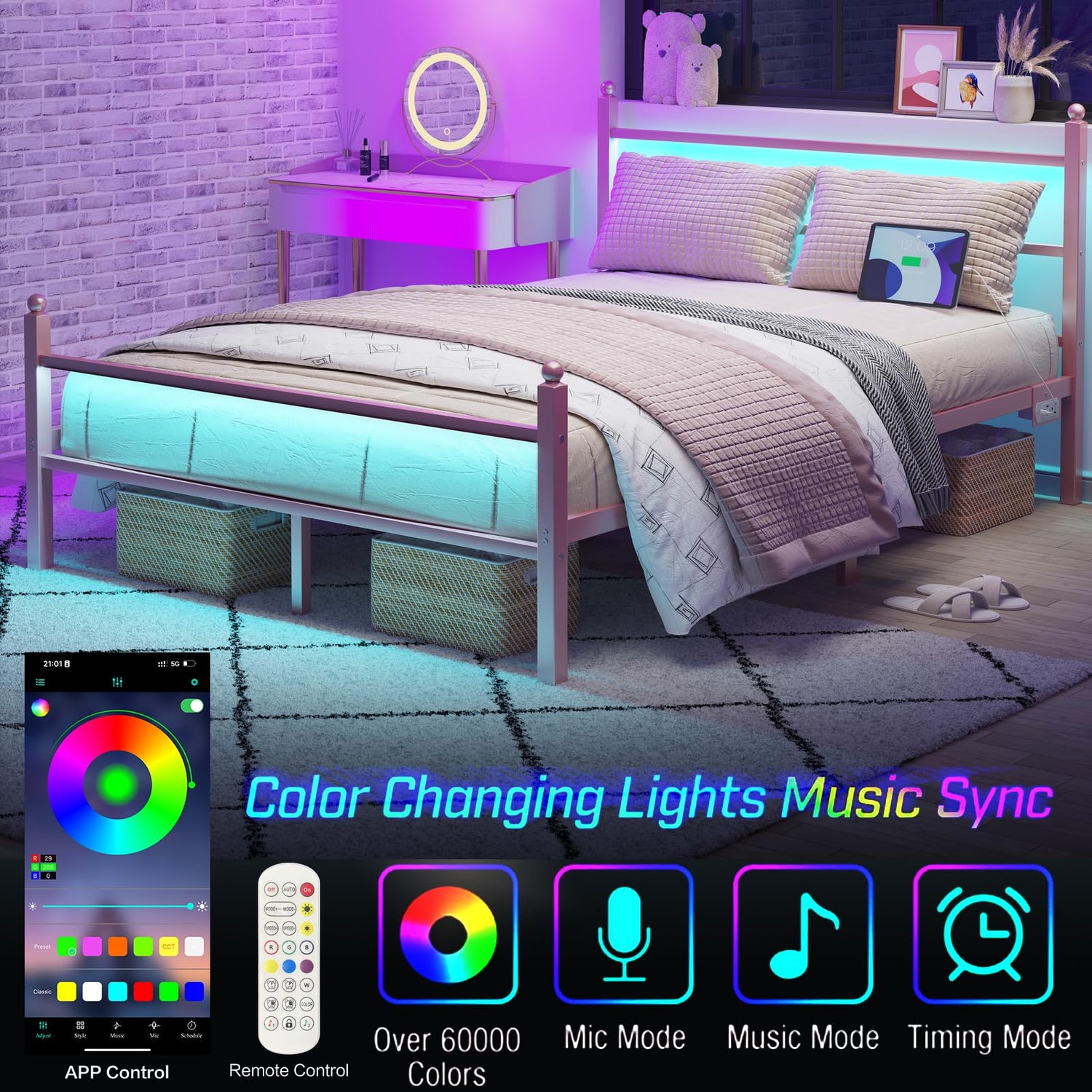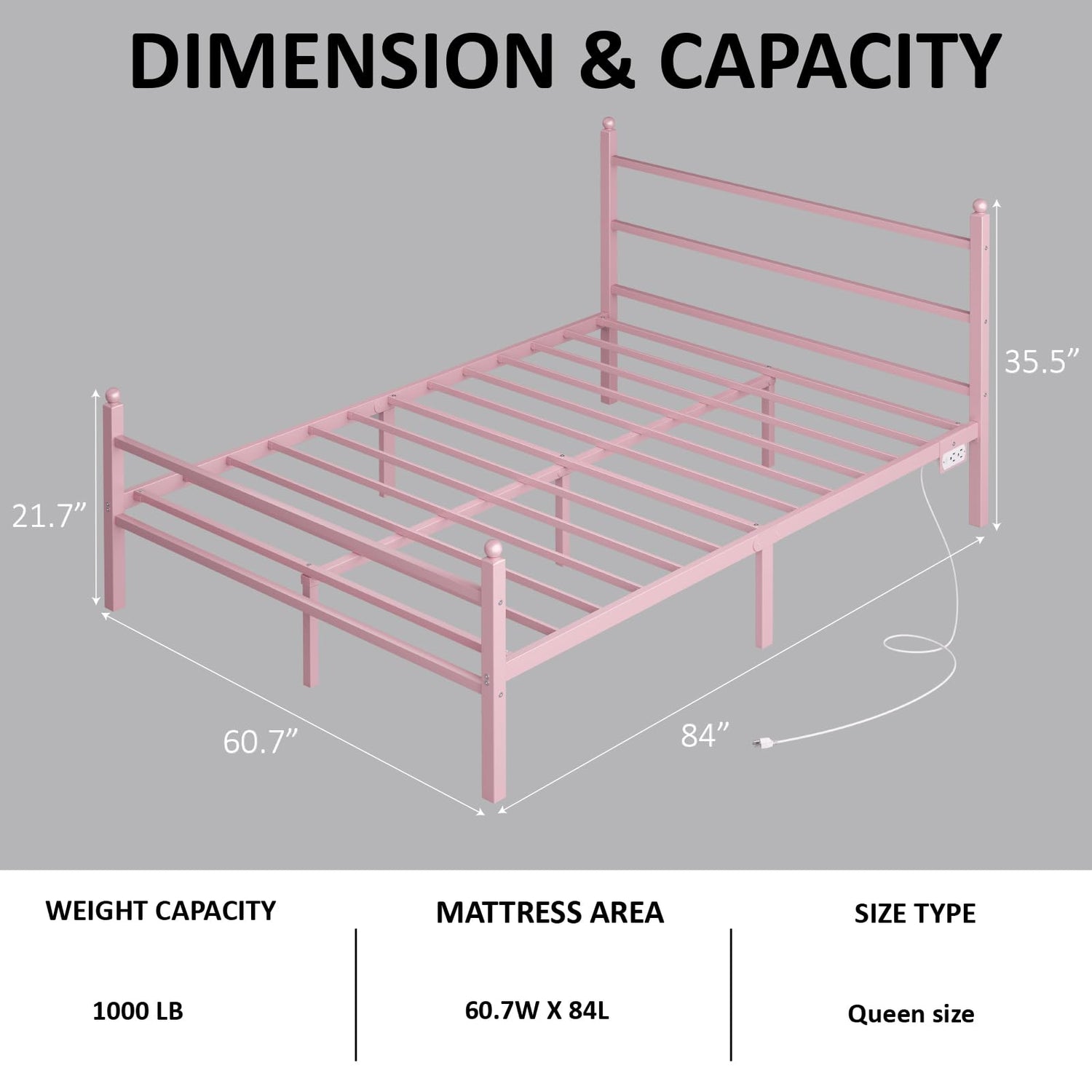 CollaredEagle Queen Bed Frame with Headboard and Footboard,Heavy Duty Steel Slats Support Metal Bed Frame with Charging Station,Pink