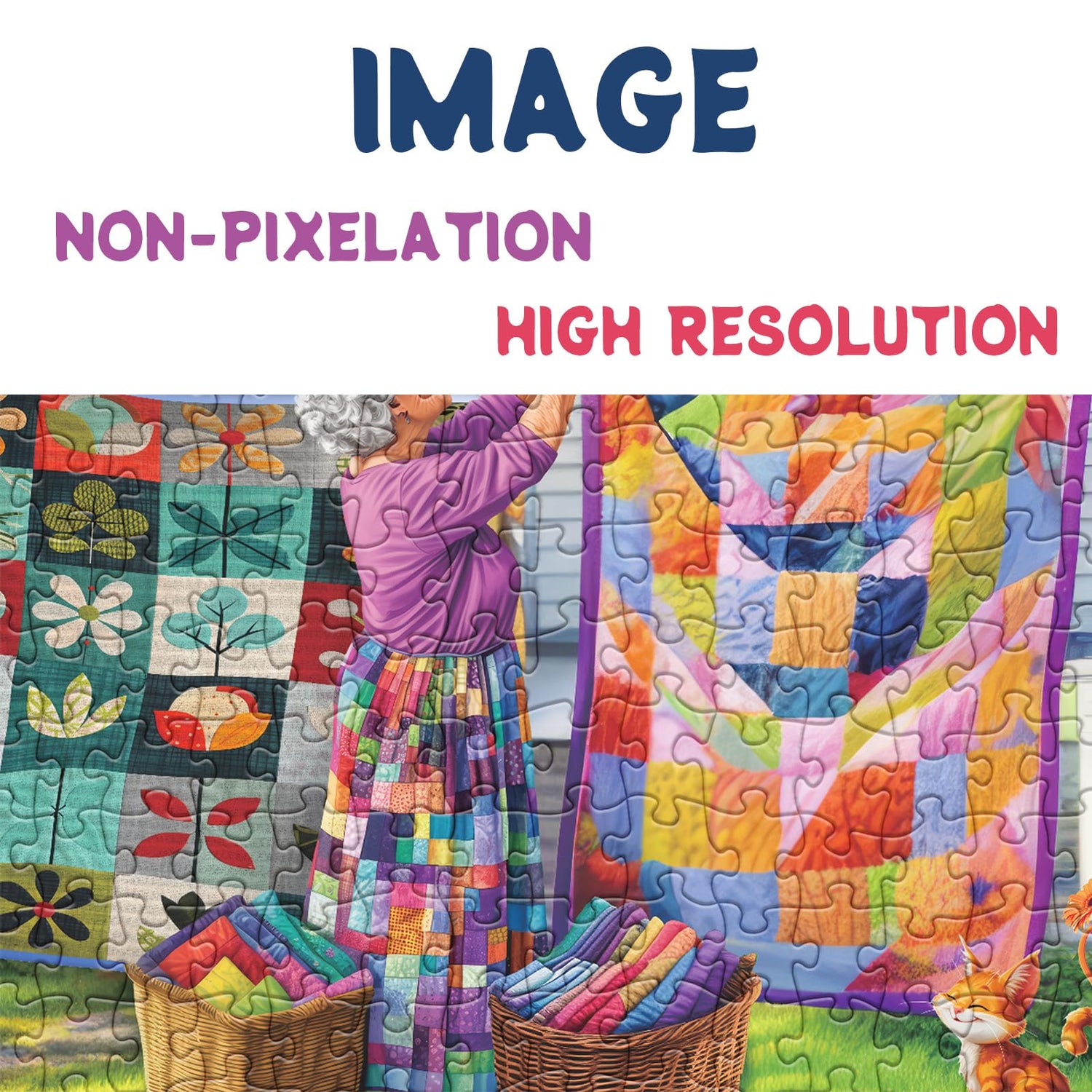 - ALL-IN-ONE PACKAGE: The grandma with quilts puzzle for adults 1000 piece and a sturdy rectangular box with a reference poster. Finished size: 19.7x27.6 in/50x70cm