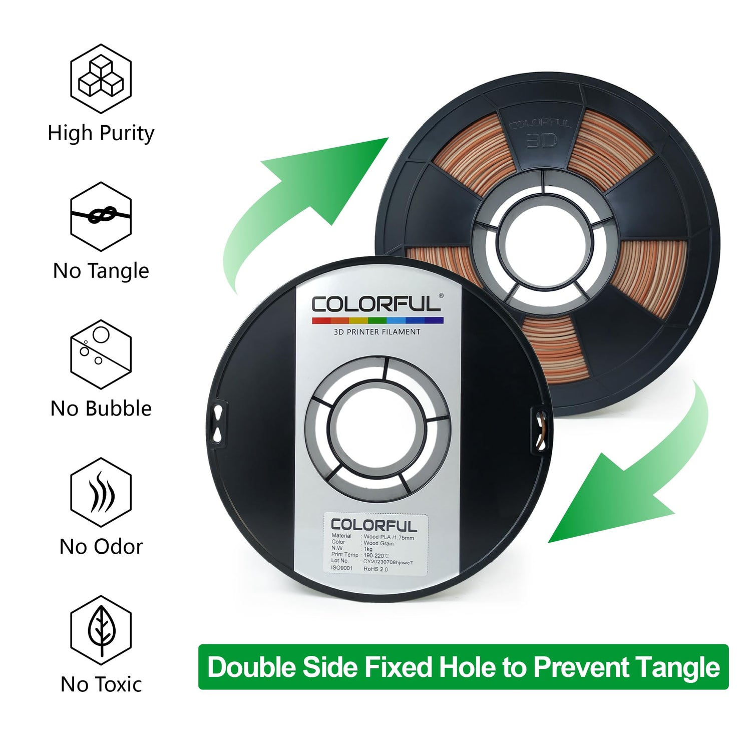 - 【Wide Compatibility】This high quality PLA wood grain filament can match with most kinds of 3D Printers and 3D Pens. Recommend Heat Bed Temp: 0-60°C, Print Temp: 190-220℃; Print Speed: 40-60 mm/s, Use Nozzle over 0.4 mm to avoid clogging. Any questions about 3D printing filament, welcome to contact with us. Enjoy with COLORFUL 3D print wood grain filament!