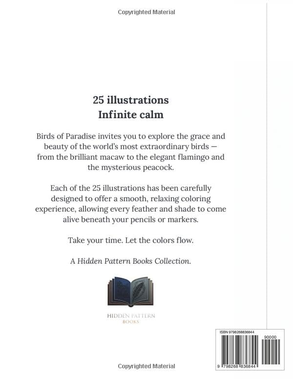 Birds of Paradise is a premium adult coloring book featuring 25 beautifully detailed bird illustrations designed to inspire calm, creativity, and mindfulness.