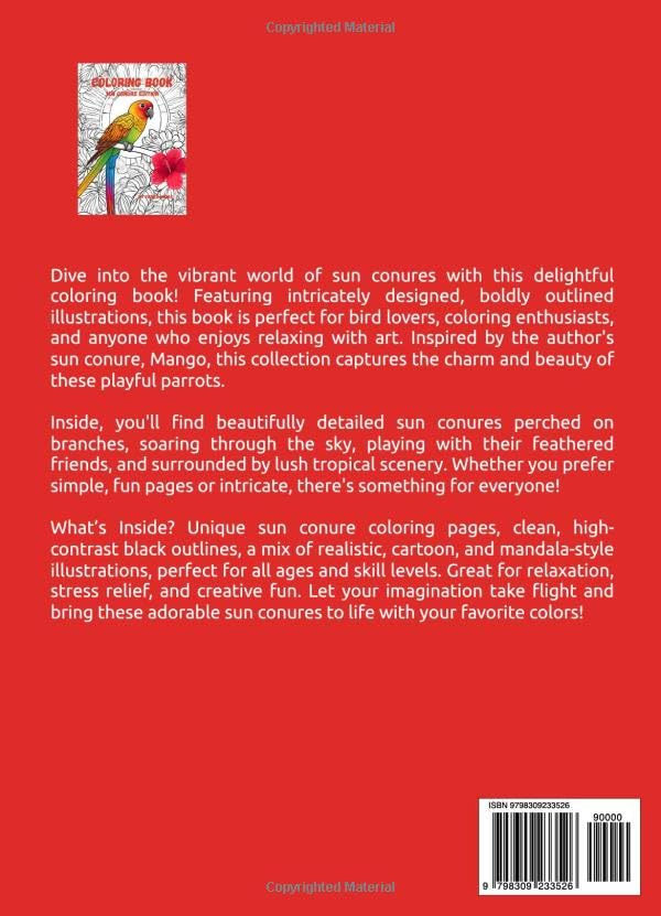 Details: Dive into the vibrant world of sun conures with this delightful coloring book! Featuring intricately designed, boldly outlined illustrations, this book is perfect for bird lovers, coloring enthusiasts, and anyone who enjoys relaxing with art. Inspired by the author's sun conure, Mango, this collection captures the charm and beauty of these playful parrots.