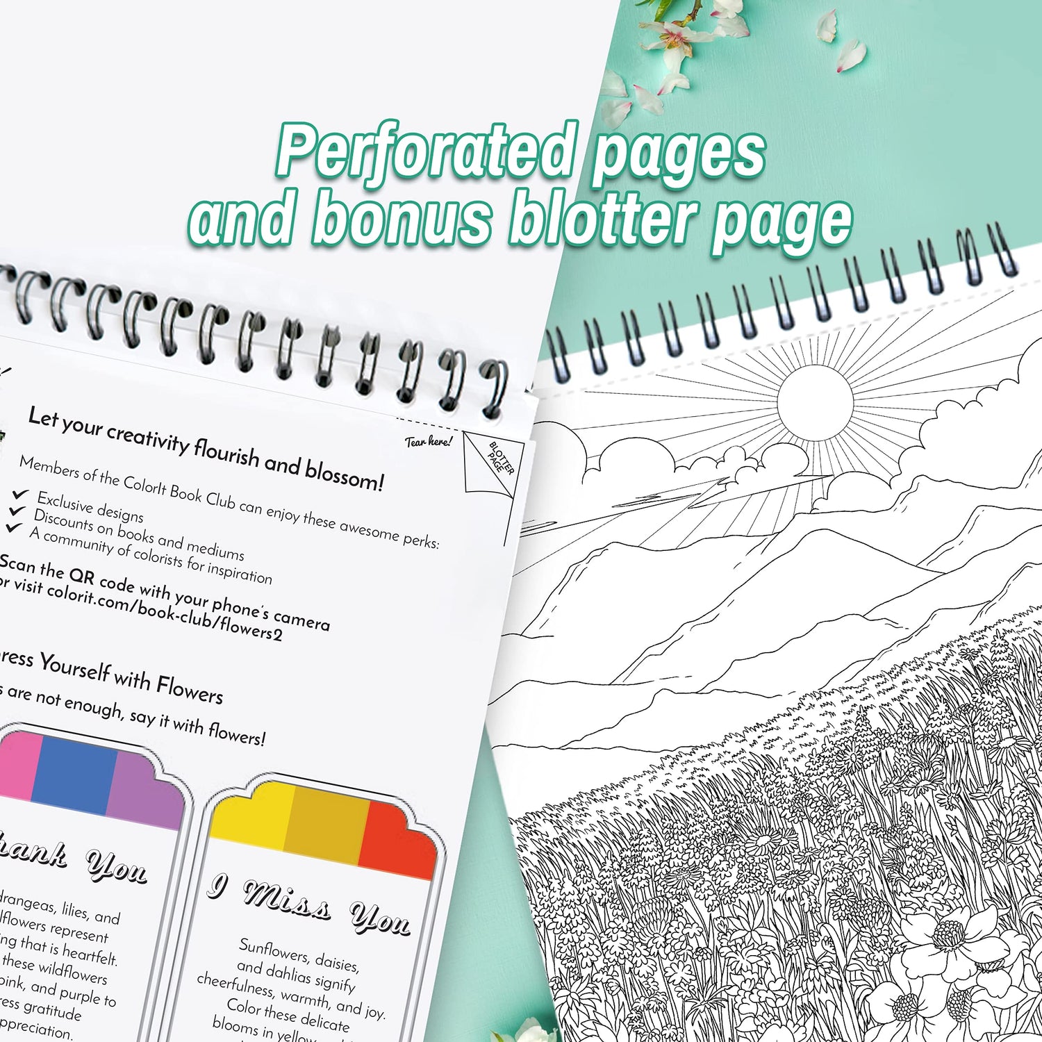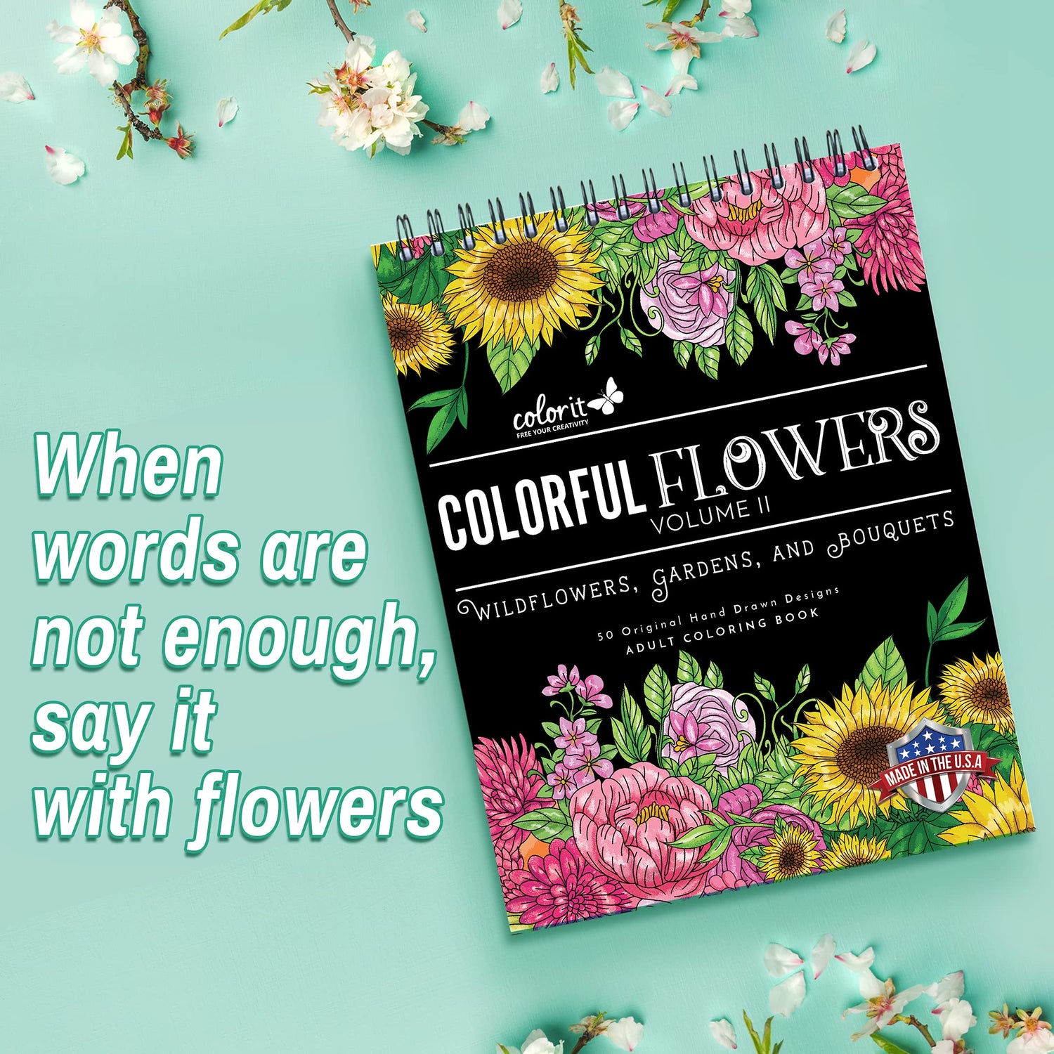 ColorIt Colorful Flowers Volume 2 Wildflowers, Gardens, and Bouquets Adult Coloring Book, 50 Original Designs, Thick Paper, Spiral Binding, USA Printed, Lay Flat Hardback Book Covers, Blotter Paper