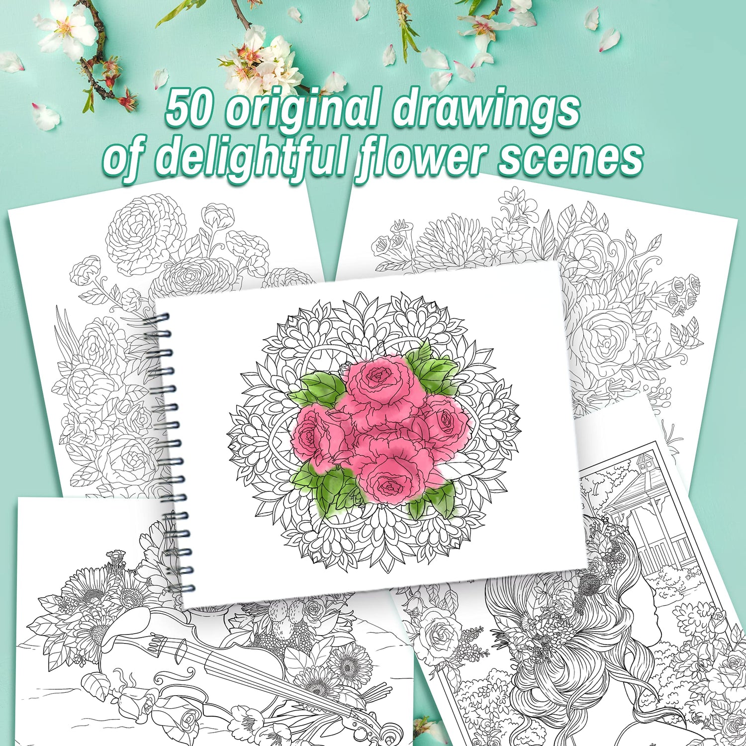 - 50 Stunning Flower Designs: Explore 50 beautiful flower designs that are perfect for all coloring lovers. This adult coloring book features lush gardens and dreamy wildflowers that are sure to relax and inspire any coloring enthusiast