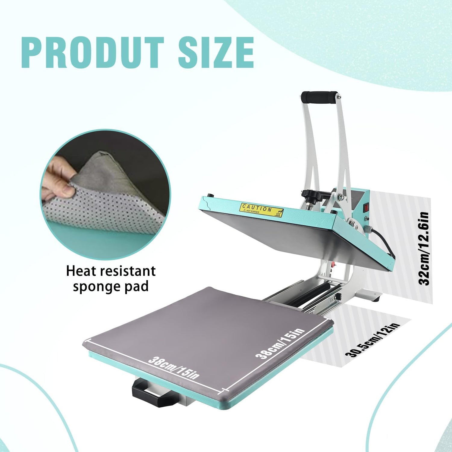 ColorSub 15x15 Heat Press for T-Shirt with Slide Out Drawer, Sublimation Heat Press Machine, Teal