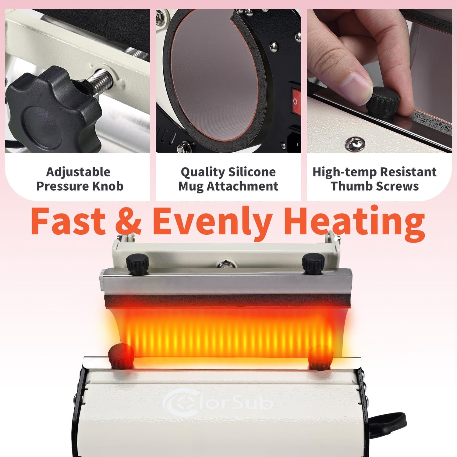 - 【Change Your Life Style】ColorSub mug heat press fits a wide array of mugs, tumblers, glassware, cups, water bottles, and sippy cups. Just use our heat press to dye your favorite patterns on tumbler blanks, send it as a meaningful gift to your loved one or your sincere customers. NOTE: It's a normal phenomenon that the temperature gets down when place the tumbler into the machine.