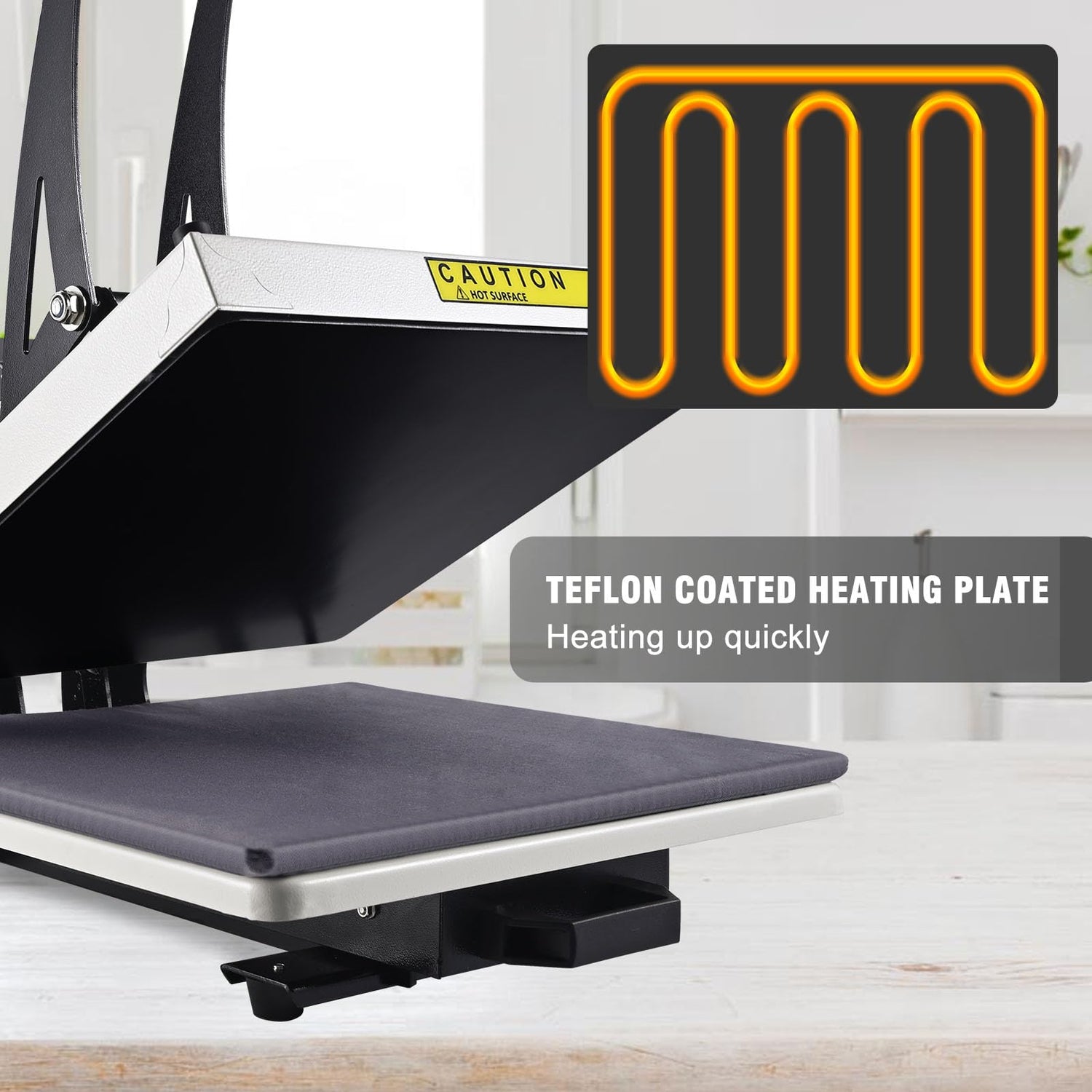 - 【TEFLON COATED HEATING PLATEN】 This heat press is covered by teflon spray paint process which is non-sticky and can prevent burning, makes it easier to clean than Teflon sheet and can make printing more steadier.