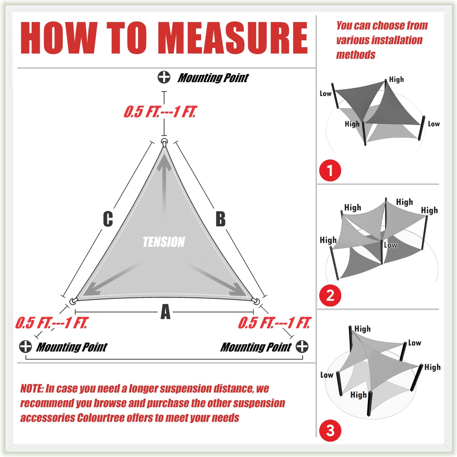 - ★【INSTALLATION GUIDE】: Installation hardware kits are required and sold separately, each D-ring will require one cable rope (DO NOT use nylon ropes, they break easily!!). Connect the other ends of cables to existing poles, trees or wall with shade sail hardware kits, high quality ColourTree hardware kits and cables are strongly recommended for best performance and appearance.