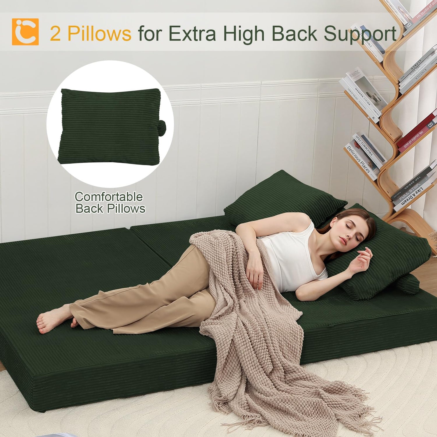 COMAX Convertible Sofa Bed, Folding Floor Couch Corduroy Fold Out Couch Bed Futon Sleeper Mattress with Pillows, Boneless Sofa Comfy Lounge Loveseat for Living Room Bedroom, Green