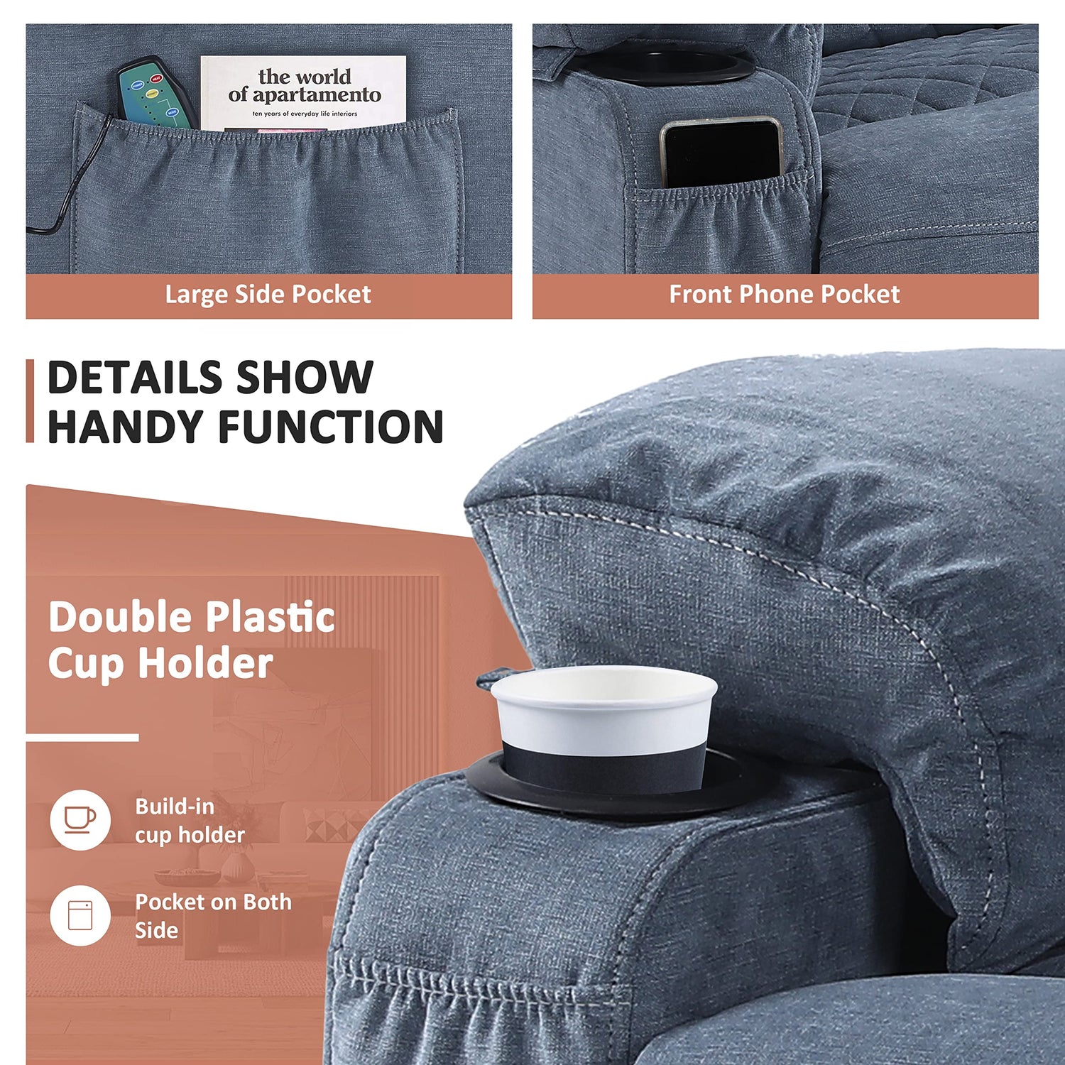 Details: Comermax Fabric Massage Recliner Chairs with Heat Massaging Manual Reclining Chair Overstuffed Heated Recliners with Cup Holders for Adults Blue