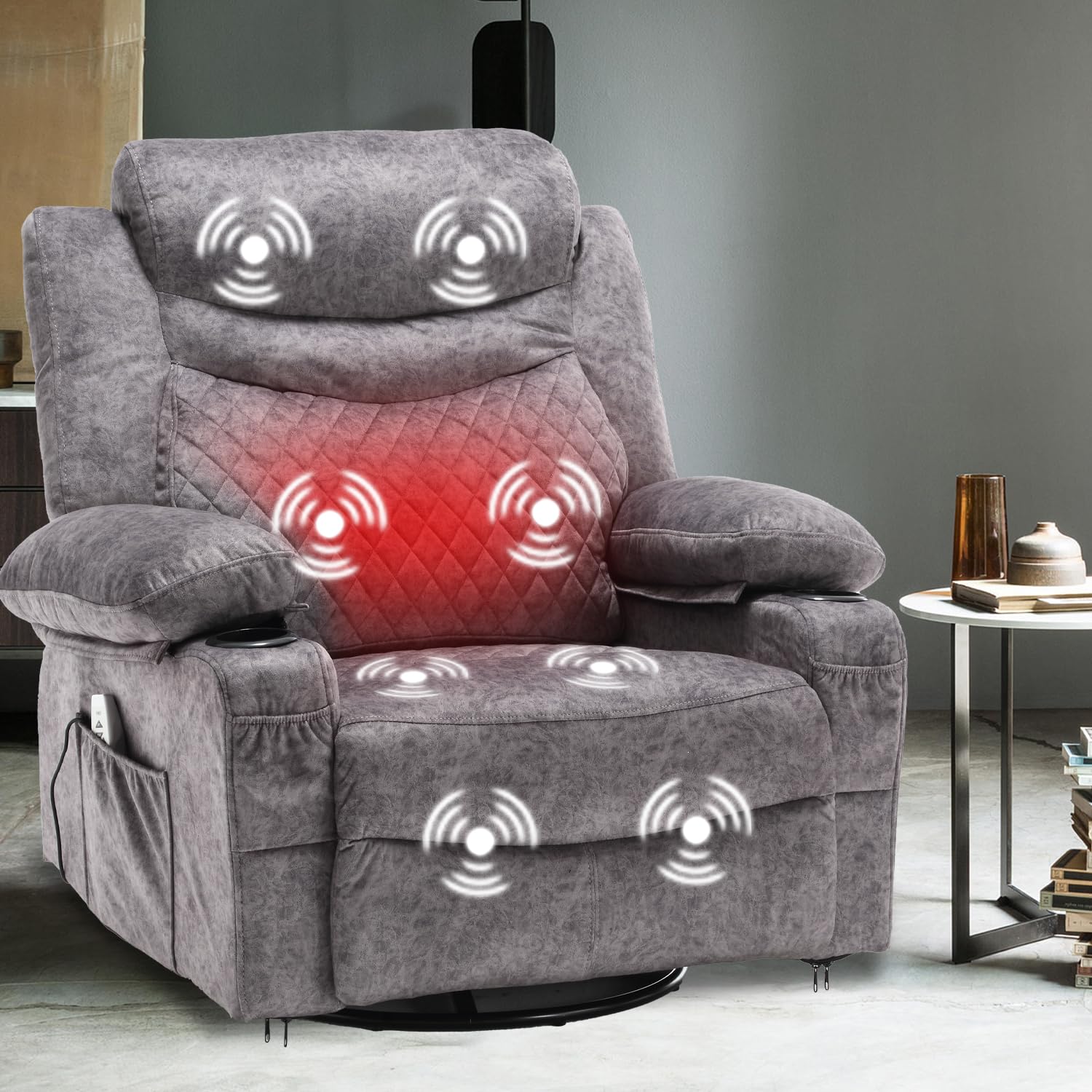 - Swivel Rocker Recliner Chairs: Apart from the normal massaging and heated functions, 1151GSM is also a nice choice for relaxation for its 270° swivelling and 30° rocking functions. Distinct from most manual recliners of which the backrests can't be fixed at the reclining position, this power recliner can be flexibly adjusted to various angles at a range of 90-150 degrees. You can always find a nice position for entertainment, napping, reading or nursery