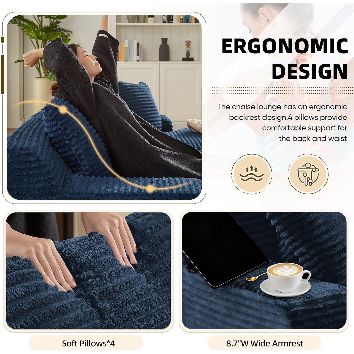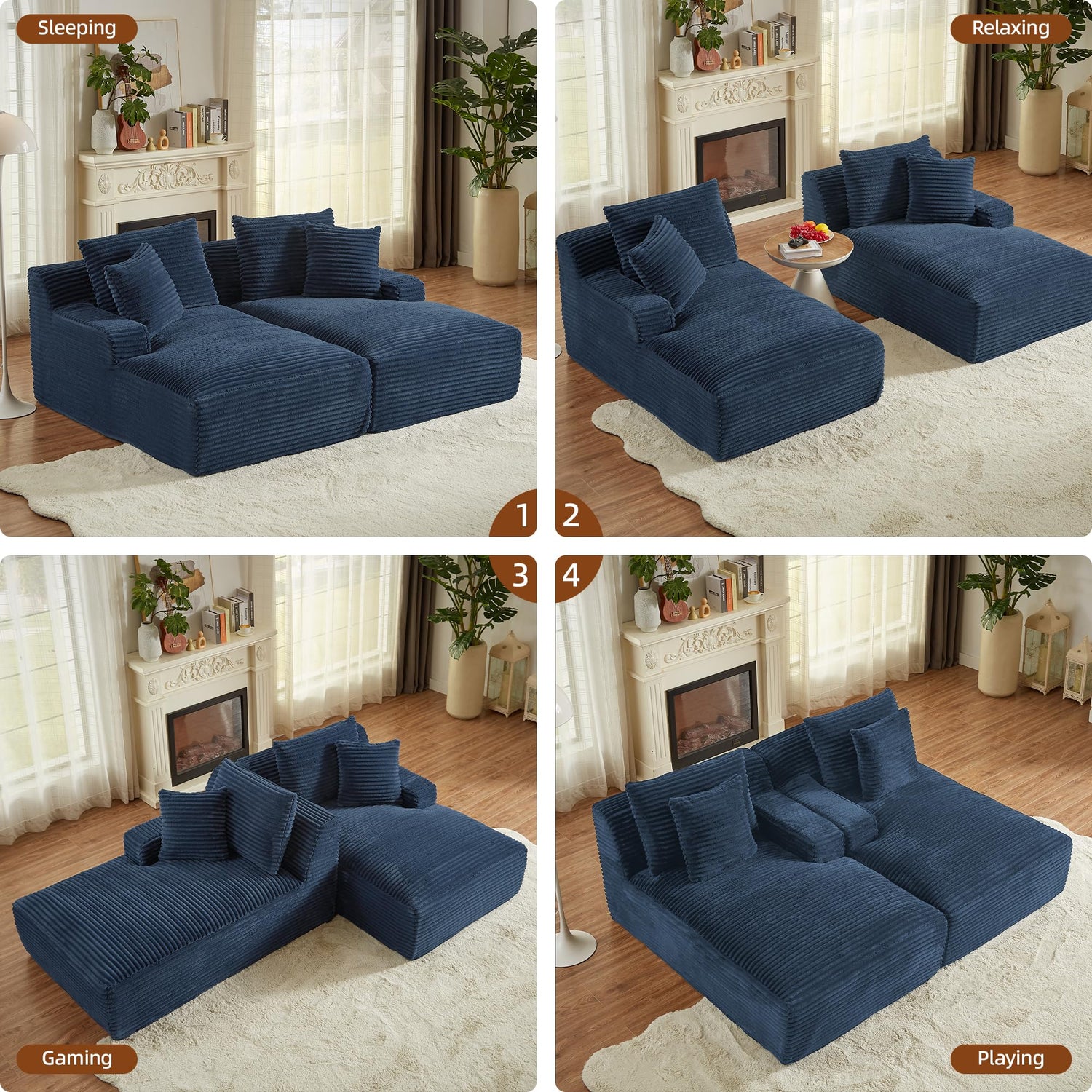 Details: ComeWay 78" Oversized Double Lounge Chaise, Fluffy Upholstered Boneless Cloud Couch No Assembly Required with 4 Pillows, Modern Corduroy Loveseat Sleeper Sofa for Living Room Bedroom Reading, Blue