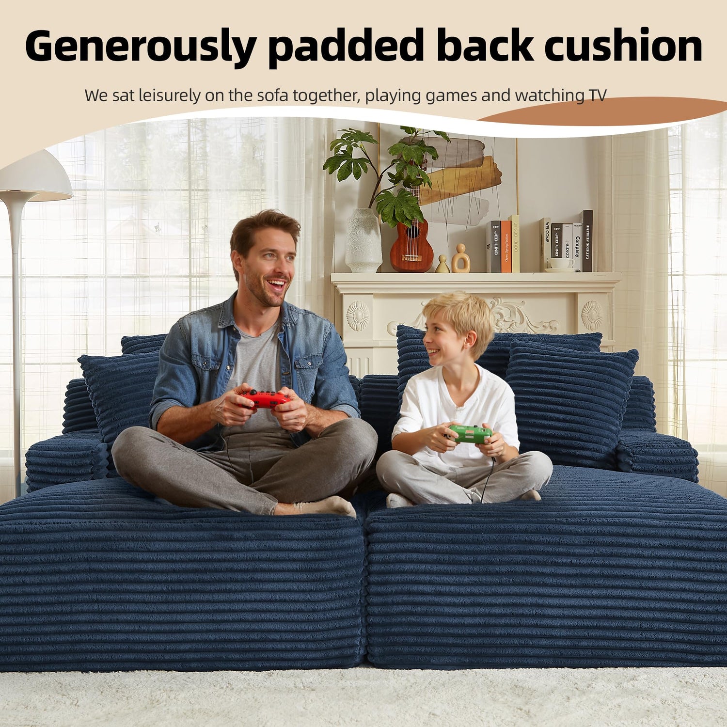 ComeWay 78" Oversized Double Lounge Chaise, Fluffy Upholstered Boneless Cloud Couch No Assembly Required with 4 Pillows, Modern Corduroy Loveseat Sleeper Sofa for Living Room Bedroom Reading, Blue