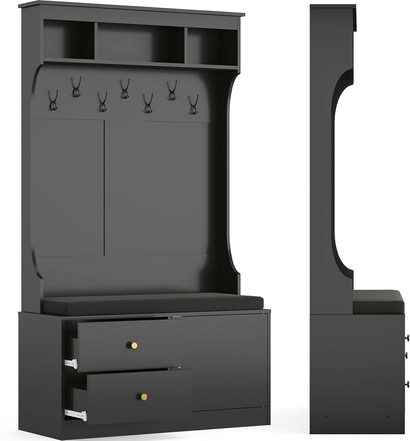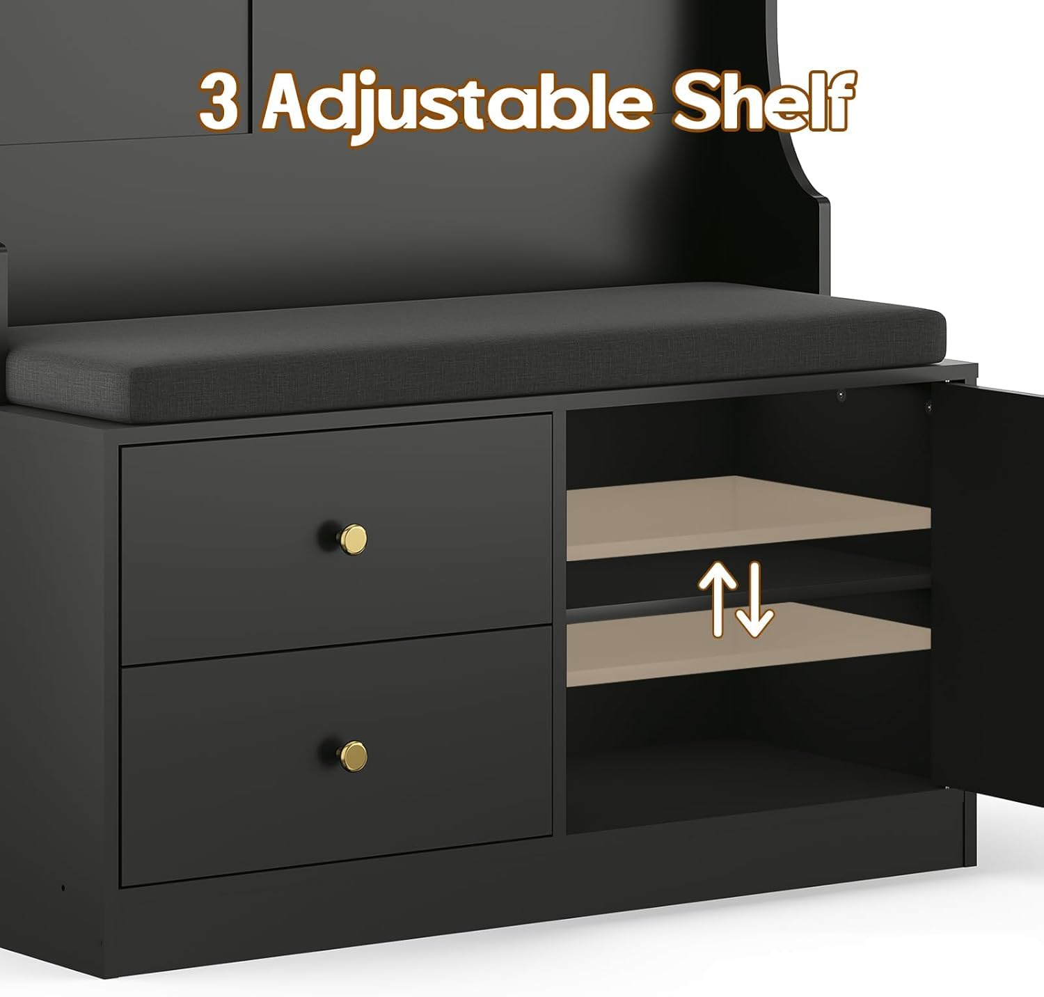 - 【6-in-1 Hall Tree with bench and shoe storage】7 sturdy hooks (15 lbs capacity each) serve as a coat rack replacement. The robust entryway shoe bench features a comfortable 1.6" thick cushion for a pleasant seating experience. 2 spacious drawers and an adjustable-height shoe rack allow you to store various sizes of shoes, while the top storage area is perfect for keeping your personal items organized.