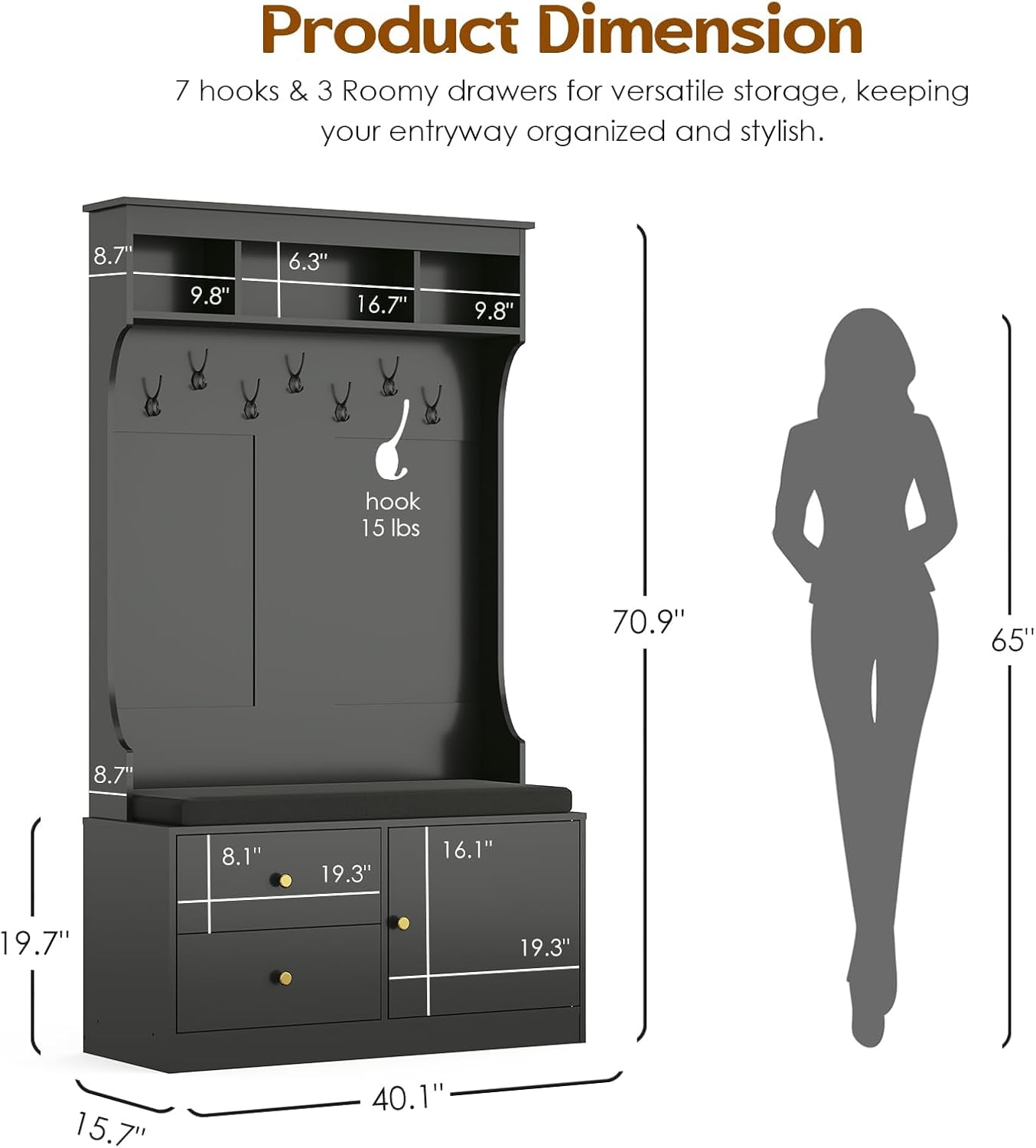 - 【Product Dimensions】 This hall tree with shoe storage measures 70.9" (H) x 40.1" (W) x 15.7" (D),2 drawers measuring 19.3" (L) x 15.7" (W) x 8.1" (H),and a shoe storage area with an overall height of 16.1" and dimensions of 19.3" (L) x 15.7" (W).