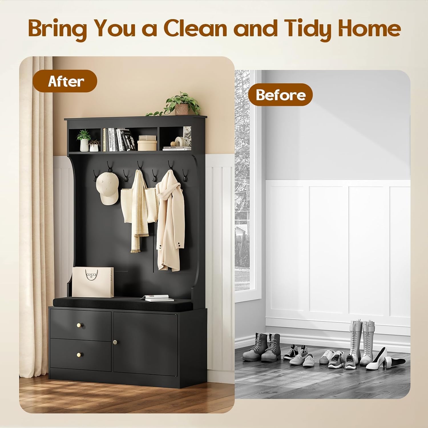 - 【Quality Assurance】 We take pride in the quality of this mud room bench with storage and seating.If you discover any damage or missing parts when you receive your hall tree with storage,please contact us immediately using the instructions in our manual.Our dedicated team is here to ensure you receive prompt and effective support.