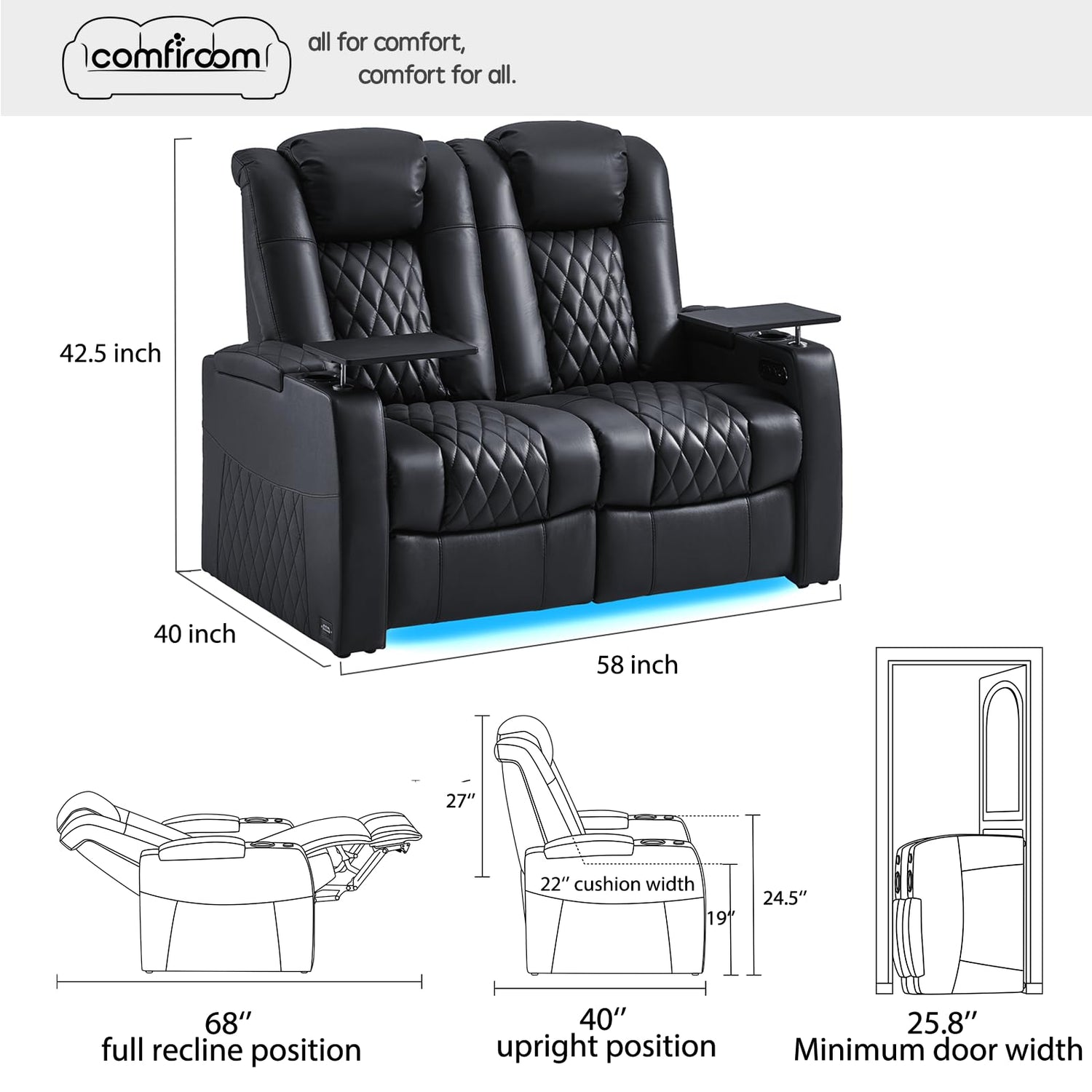 - COMFORT COMES FIRST: The Comfiroom home theater sofa is crafted from premium leather, offering a delicate and smooth touch that brings an extraordinary comfort experience, making every contact as gentle as skin. Filling with high-resilience foam that quickly bounces back and maintains its shape, ensuring the same comfortable support every time you sit down. With a maximum recline of 150° in zero-gravity mode, you will achieve the ultimate comfort