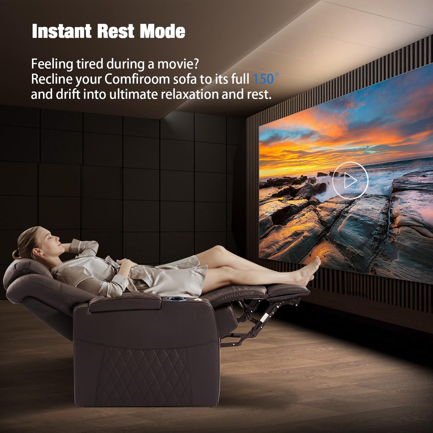 - COMFORT COMES FIRST: The Comfiroom home theater sofa is crafted from premium leather, offering a delicate and smooth touch that brings an extraordinary comfort experience, making every contact as gentle as skin. Filling with high-resilience foam that quickly bounces back and maintains its shape, ensuring the same comfortable support every time you sit down. With a maximum recline of 150° in zero-gravity mode, you will achieve the ultimate comfort