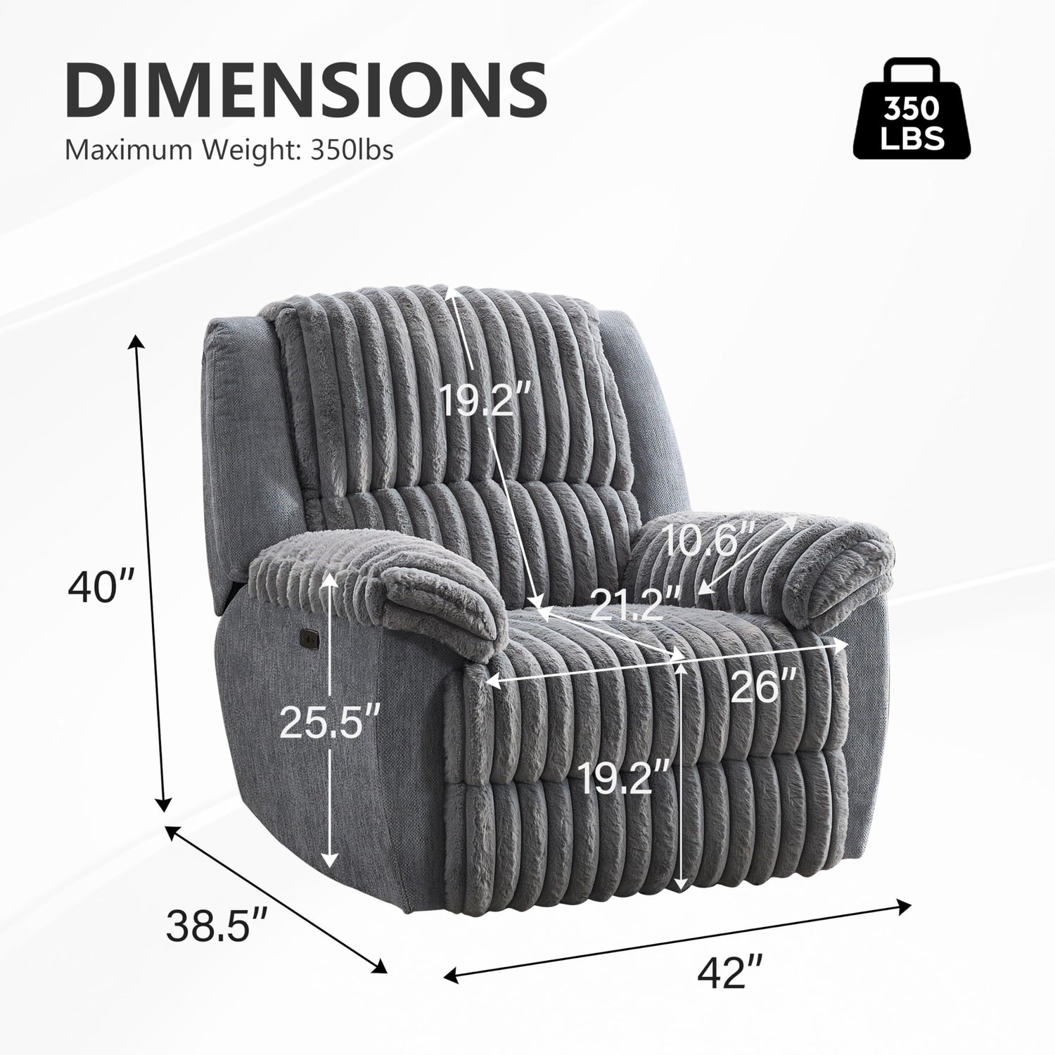 - 【Spacious Dimensions】: With a width of 20.4 inches, a seat depth of 21.2 inches, and a height of 19.2 inches, this oversized recliner is designed to accommodate a broad range of body types, ensuring everyone can enjoy its comfort.This recliner caters to various body types, including tall and plus-sized individuals, providing ample space and support.The oversized recliner can support up to 350 lbs.